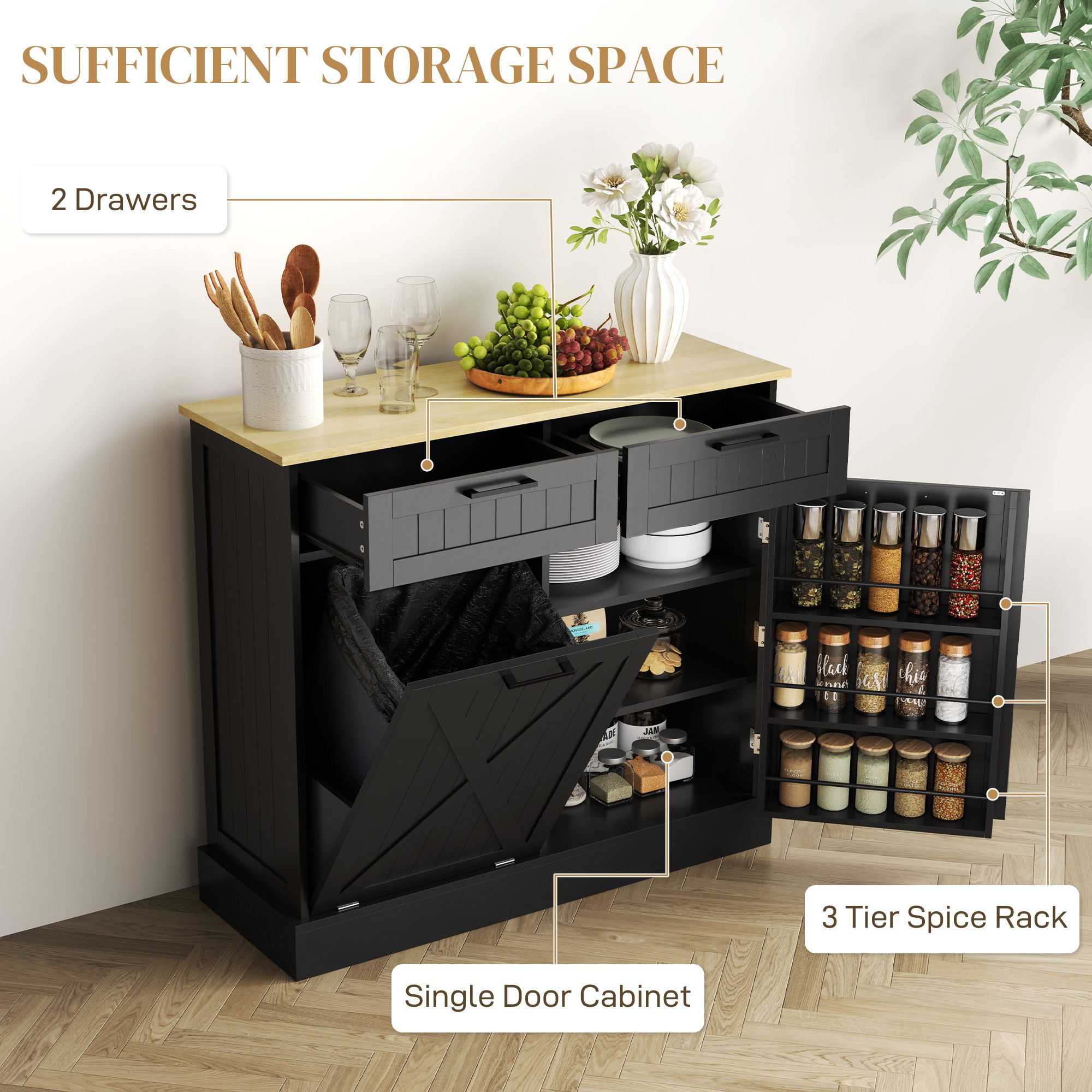 Discover the charm of the [BRAND NAME] tilt-out trash cabinet, where functionality meets farmhouse flair. Hide your trash while keeping spaces fresh with the clever hidden trash can cabinet. Store all your kitchen essentials or spice collection in the ample space featuring a 3-tier spice rack, two drawers, and a spacious top. Great as a garbage cabinet for the kitchen, sideboard cabinet, lanudry hamper cabinet, or coffee cabinet, this piece brings rustic elegance to any room.