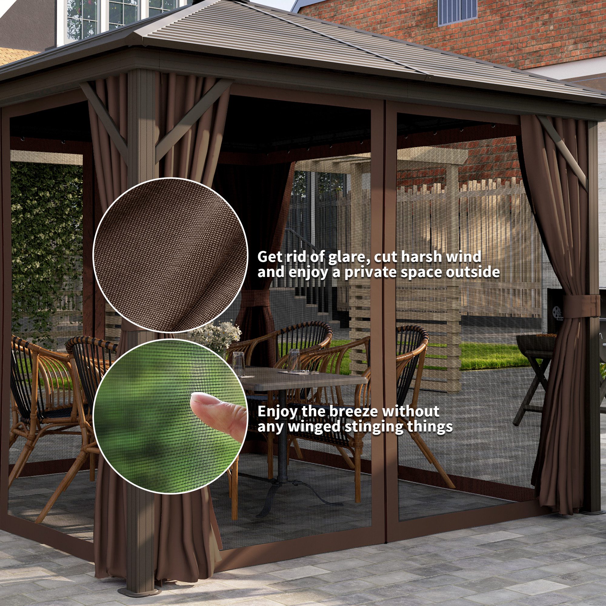 10' x 10' Hardtop Gazebo Canopy, Permanent Pavilion with Hook, Curtains, Aluminum Frame for Patio, Garden, Dark Brown