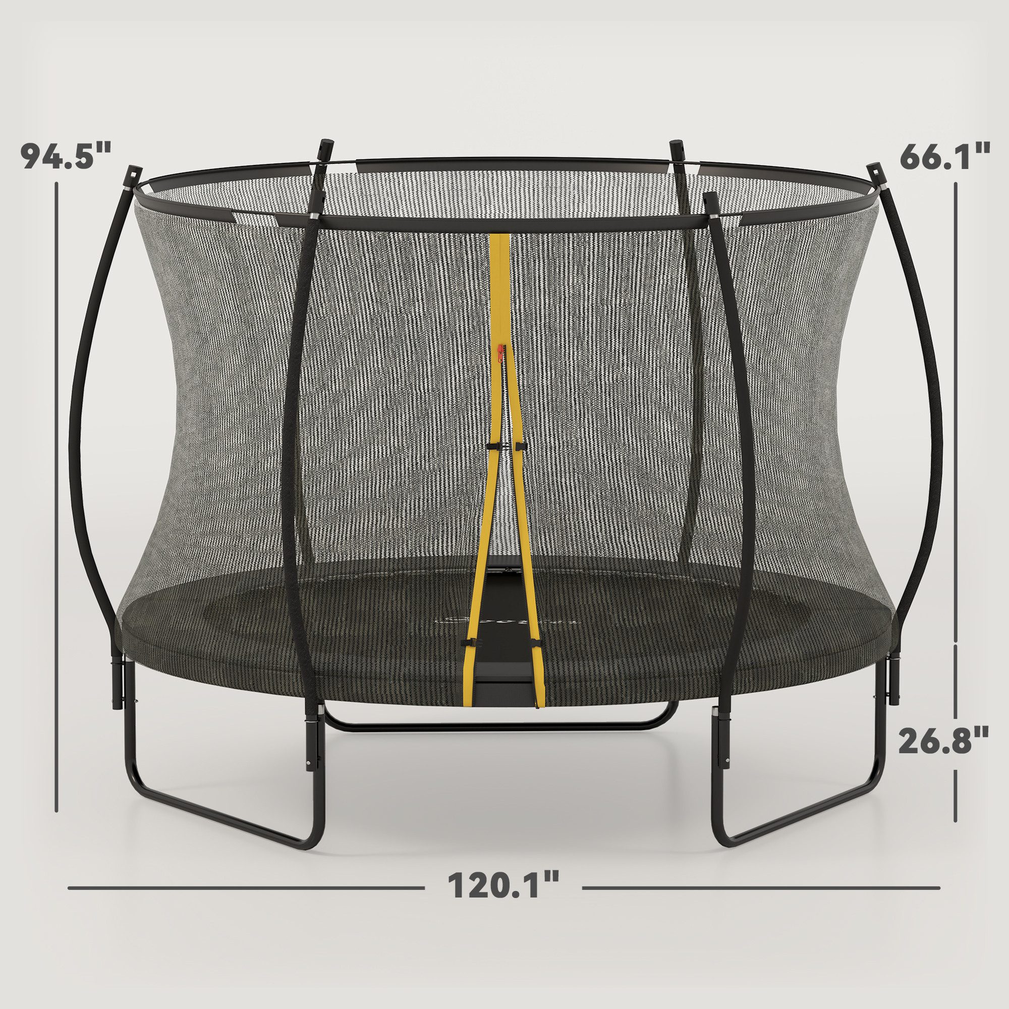 Leap into fun with the trampoline with enclosure! Featuring safe padding and curved poles for fewer injuries and 54 high-tension springs for sky-high jumps. Its U-shaped feet ensure even stability, making it the great backyard trampoline. Plus, the double-sided zipper door makes access a breeze. Enjoy safer, joyful bouncing in your own outdoor space.
