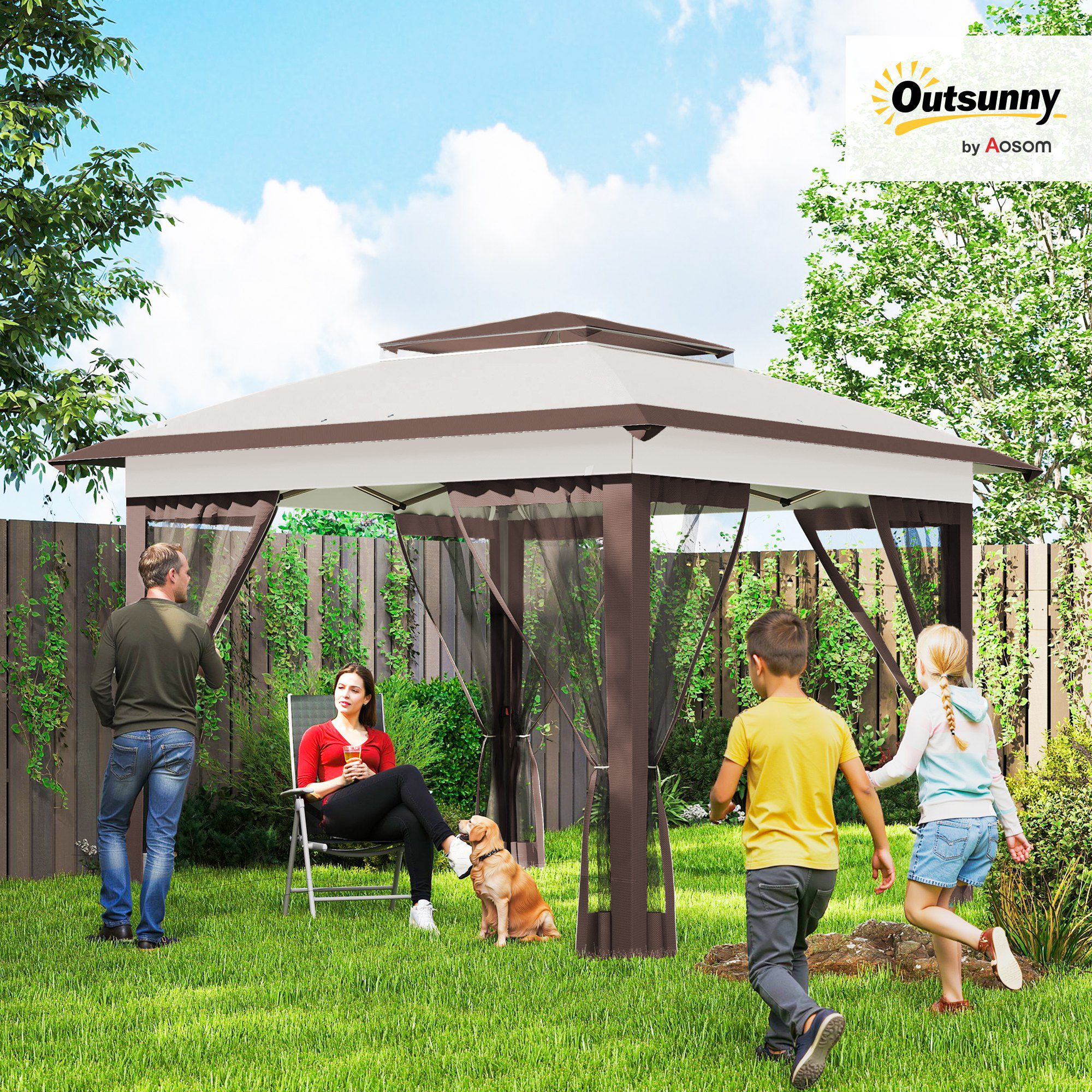 12′ x 12′ Pop Up Canopy Tent with Netting and Carry Bag, Instant Sun Shelter with 137 sq.ft Shade, Beige and Brown