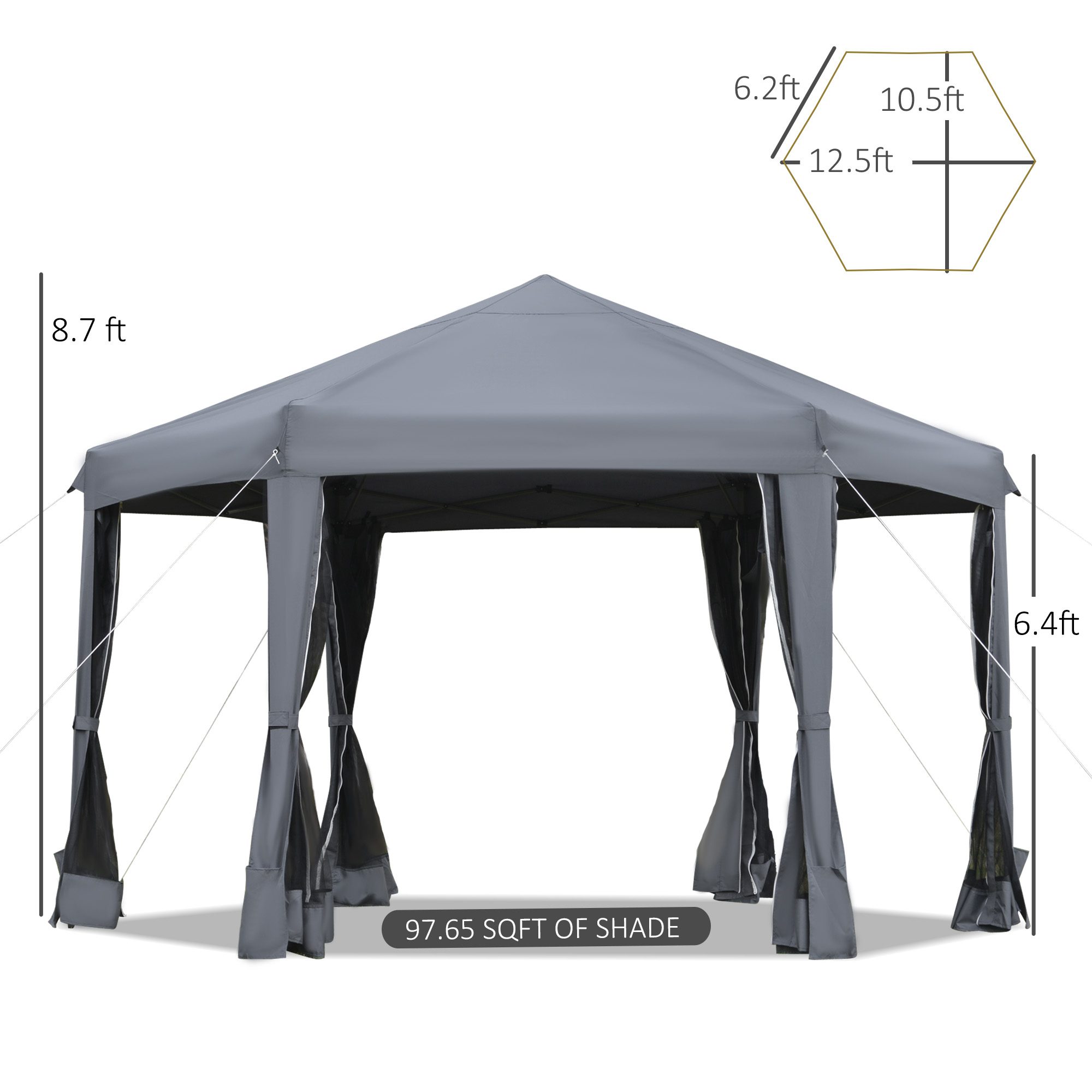 13′ x 11′ Hexagonal Pop Up Gazebo, Heavy Duty Outdoor Canopy Tent with 6 Mesh Sidewall Netting, 3-Level Adjustable Height and Strong Steel Frame, Gray