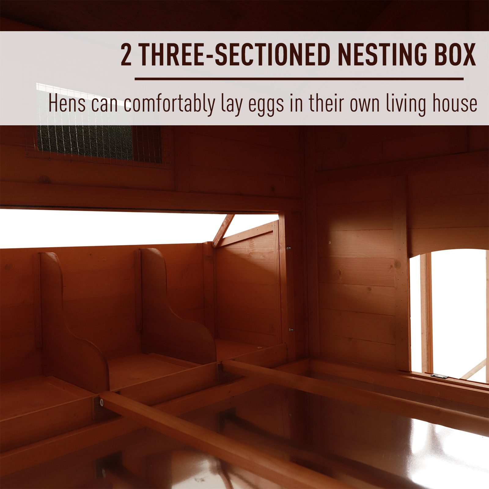 - – High quality fir wood construction with elevated house, nesting boxes, ramp, door, and attached run