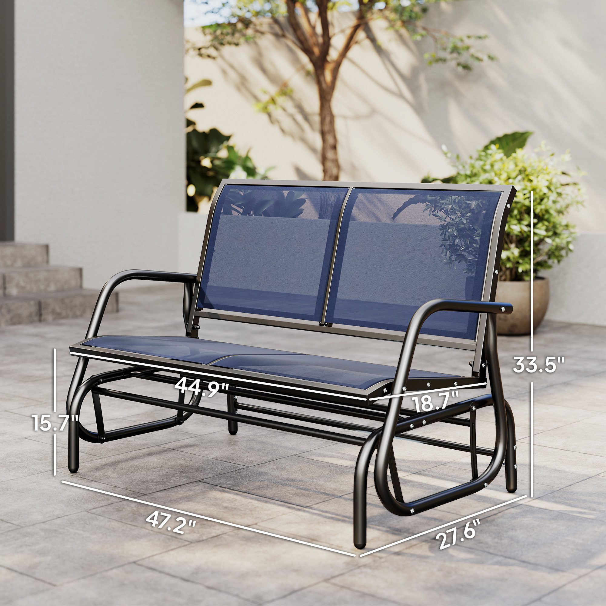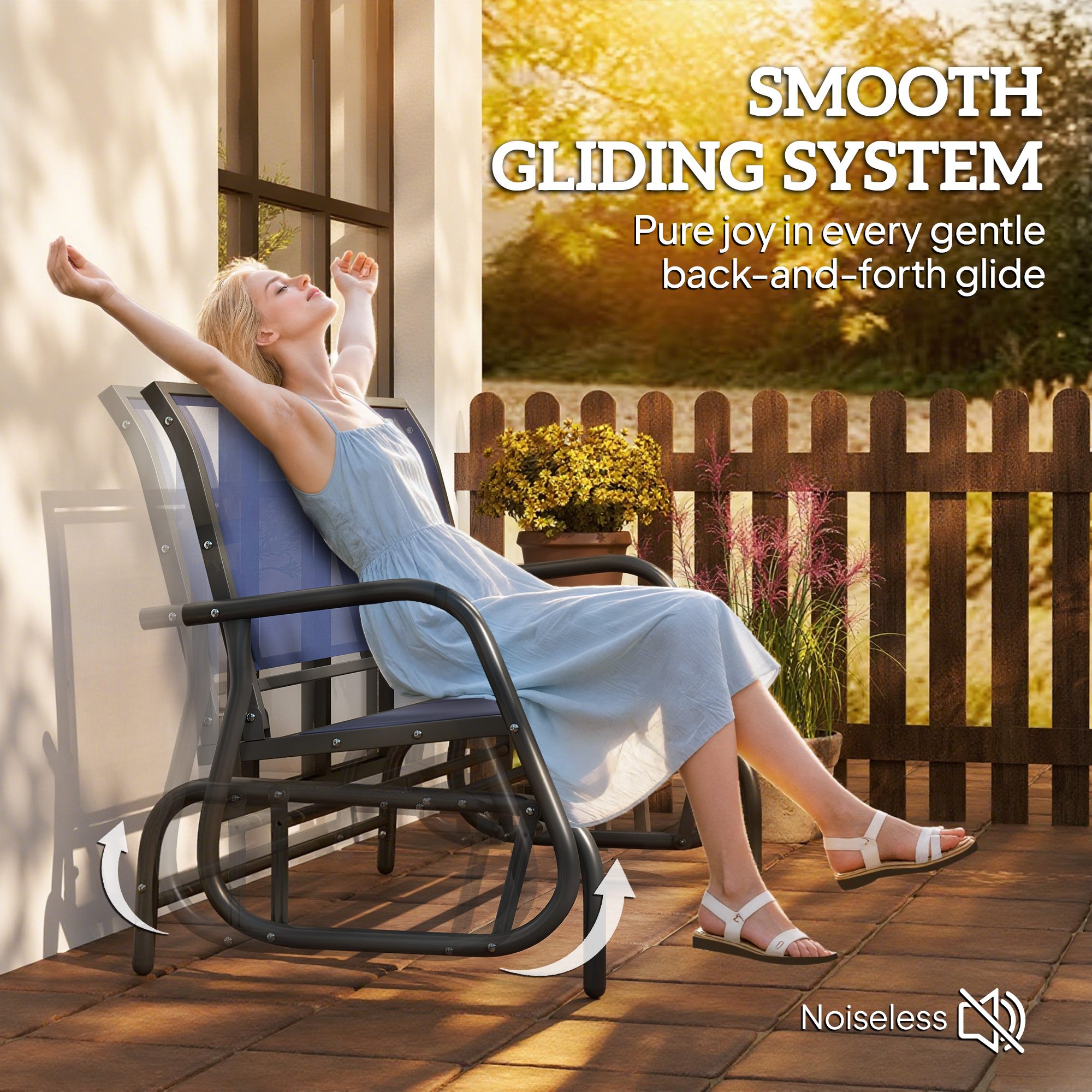 Made out of a ventilating mesh seat and backrest, this patio glider chair provides fantastic comfort and coziness. The curved rocker arms of our patio gliders for outside bring a smooth, soothing motion. This double swing chair allows you and a friend greater comfort on the patio, yard, or porch. If you prefer to read a book or take a nap in the shade rather than sunbathe, our glider chair is lightweight, letting you move it with little effort.