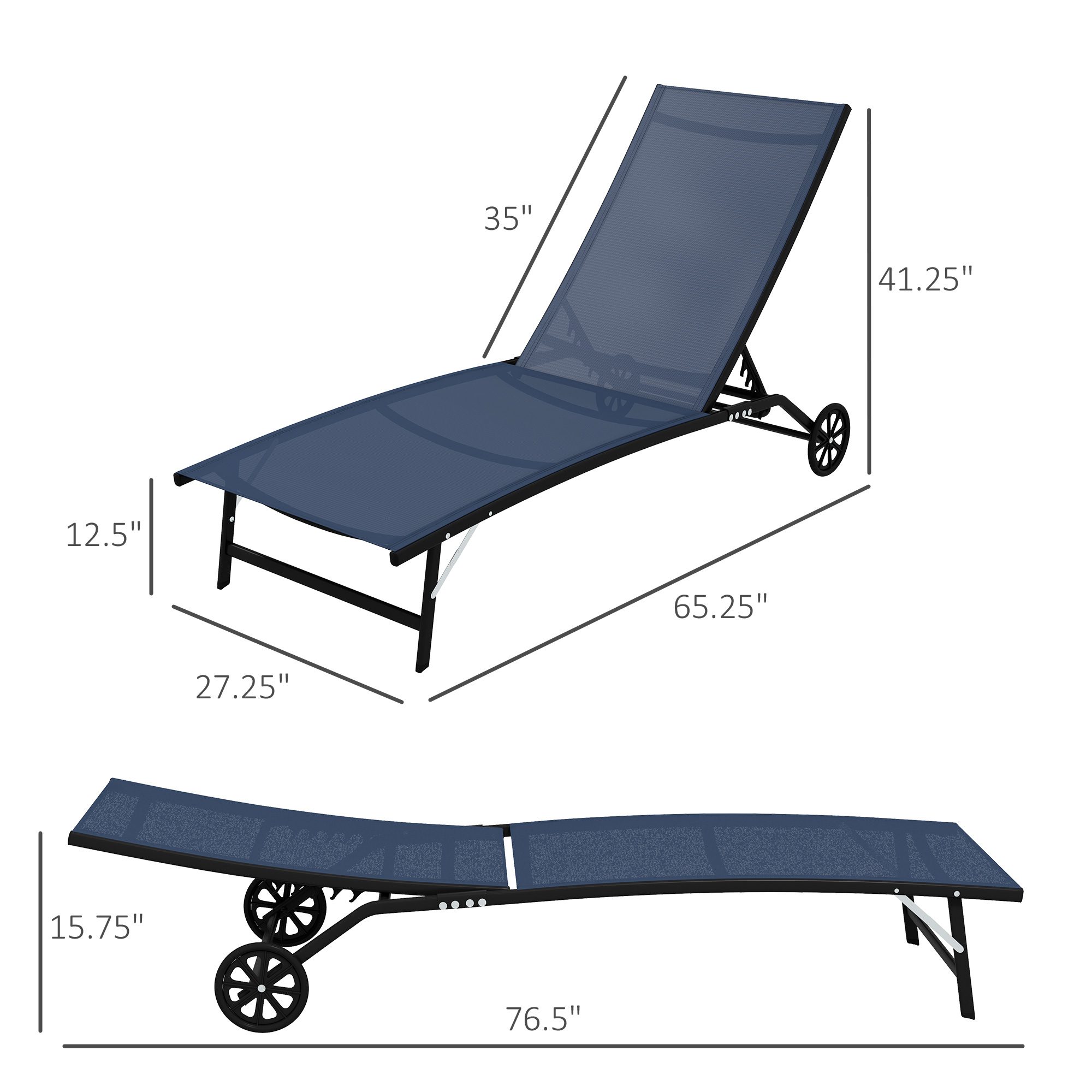 2 Piece Outdoor Chaise Lounge Chairs with Wheels, 5 Level Adjustable Backrest for Patio, Beach, Yard, Pool, Dark Blue