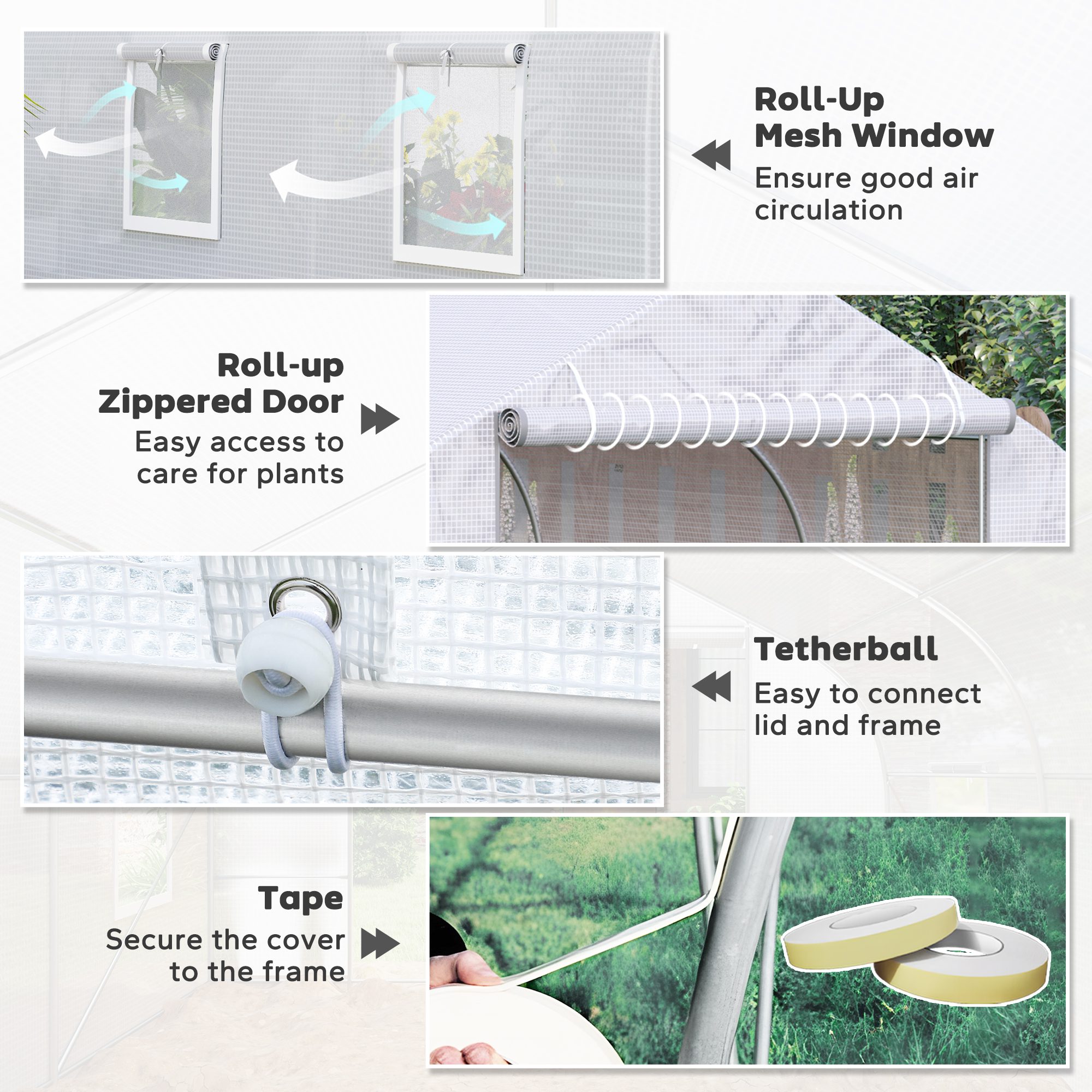 • – Includes tethers and single-sided tape to attach the cover to the steel frame