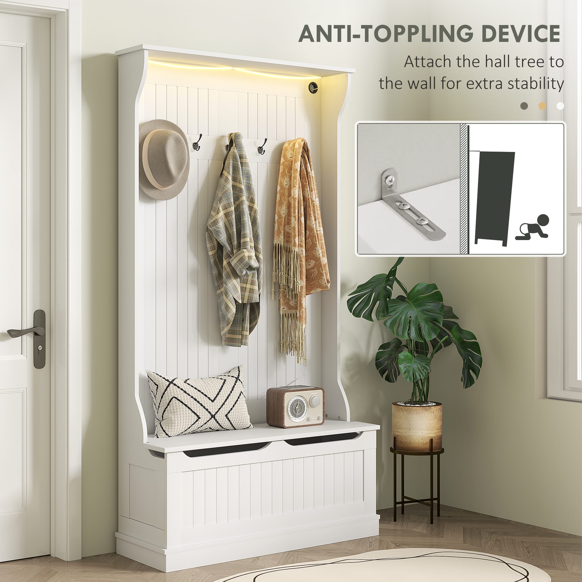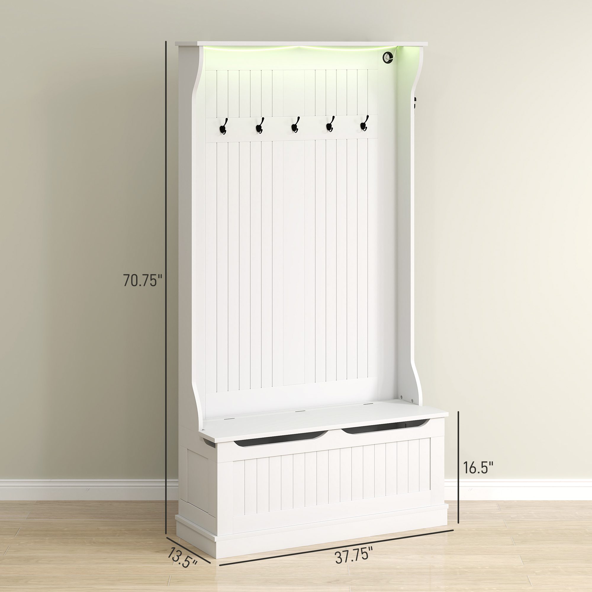3-In-1 Entryway Bench with LED Lights and Coat Rack, Hall Tree with Bench and Shoe Storage, 5 Hooks for Hallway White