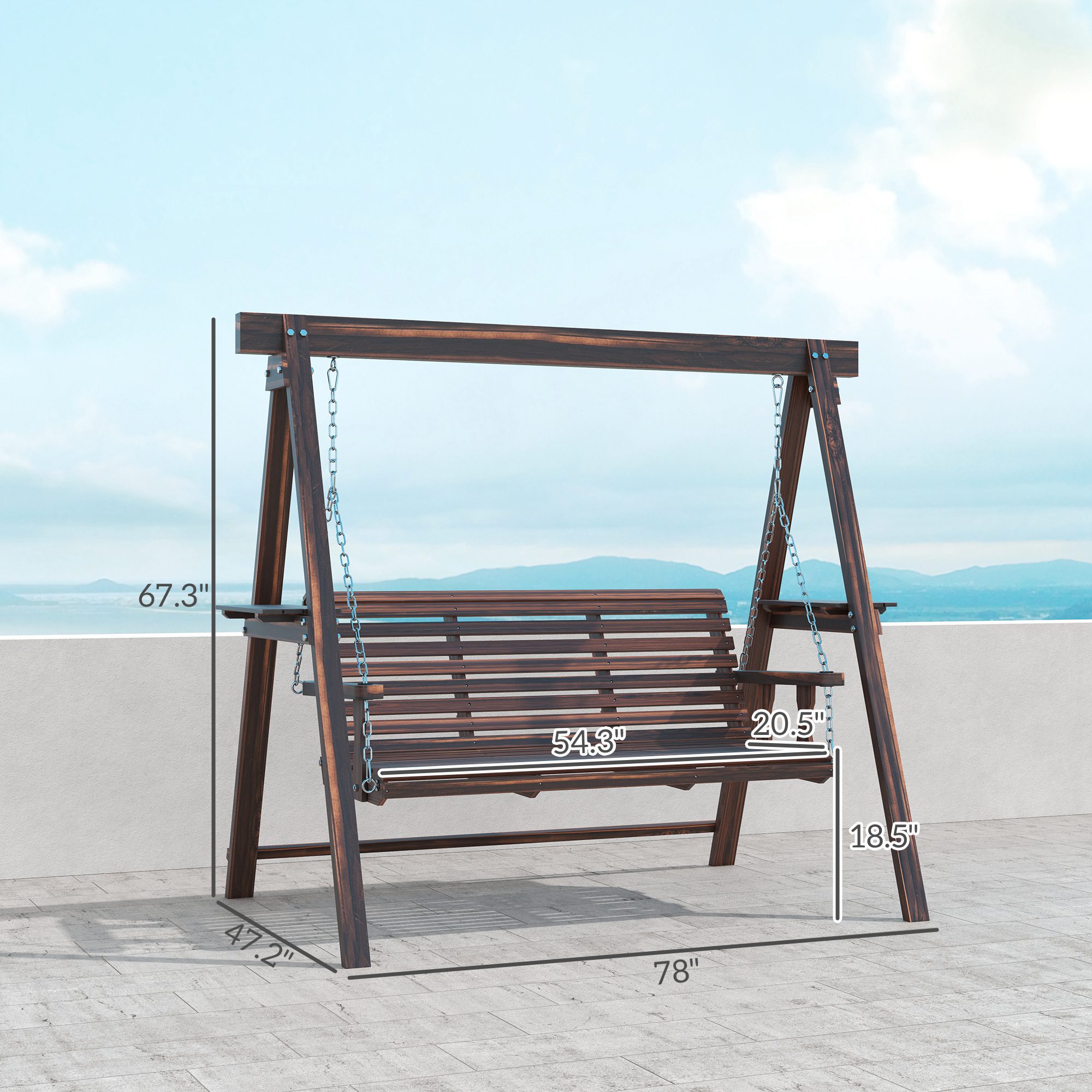 3 Seat Wooden Porch Swing with Stand, Patio Swing with Side Tables, for Garden, Poolside, Backyard, Carbonized Brown