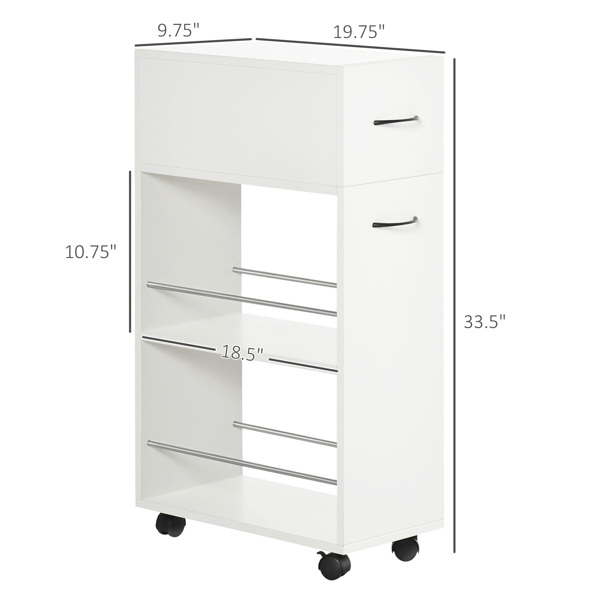 • – Overall Dimensions: 9.75″ L x 19.75″ W x 33.5″ H