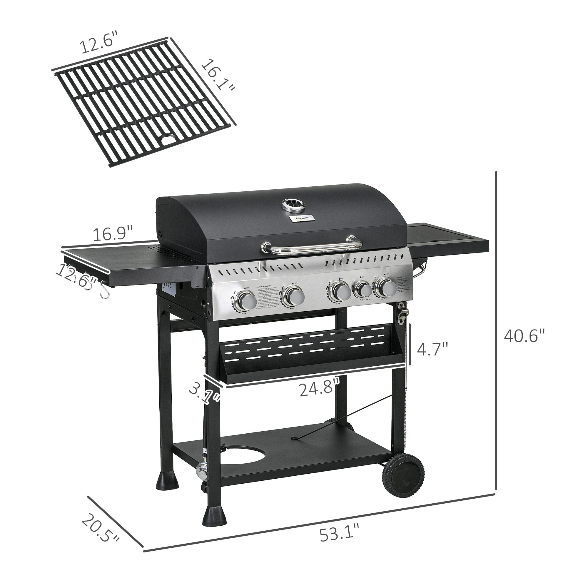 4 Burner Propane Gas Grill with Side Burner, 40,000 BTU Outdoor Barbeque with Shelves, Thermometer, Bottle Opener, Black
