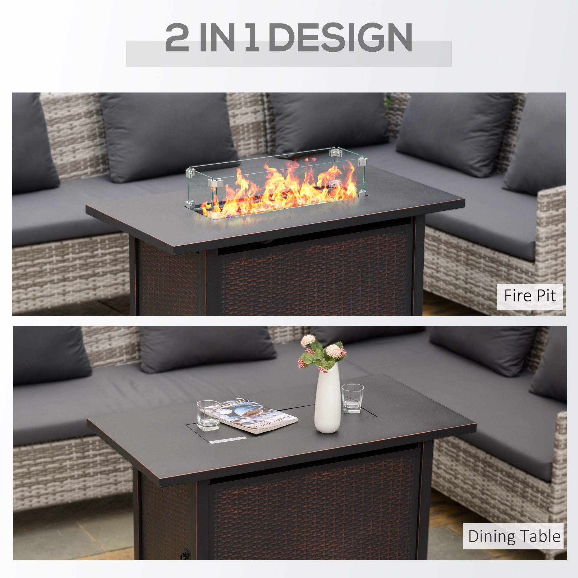 Enjoy the ultimate backyard ambiance year-round with this functional firepit table for home from [BRAND NAME] that has both a fire pit and dining table. The gas fire pit table features a classic wicker design base that cleverly conceals the propane tank inside. Complete with a 50,000 BTU CSA-certified burner, you can enjoy all the pleasures of a charming flame without worrying about messy ashes. Our propane fire table makes a classy addition to your home.