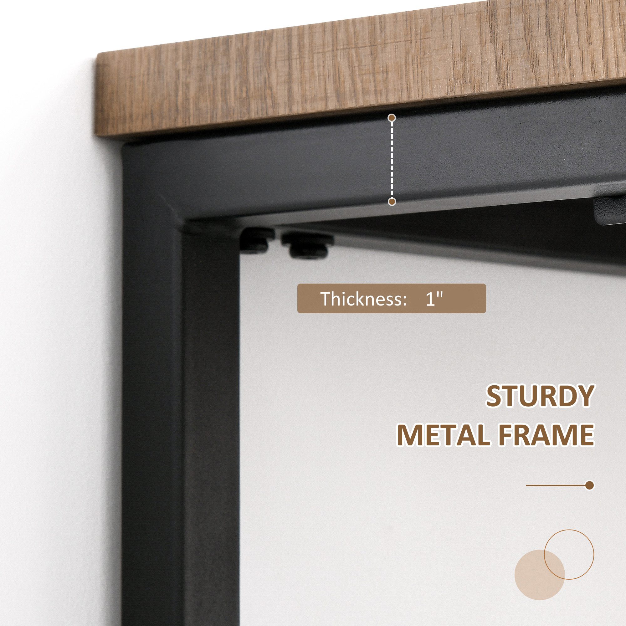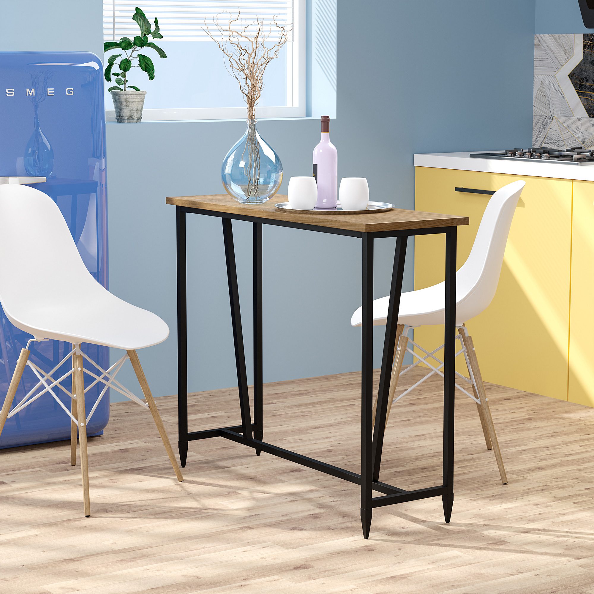 Tempted to wash away the day’s stresses with some snacks and a drink? This [BRAND NAME] kitchen bar table has got you covered. The clean-lined dark metal frame with a rustic appearance makes it a great fit in a modern or traditional setting. Geometric-inspired steel base offers reliable support and stability while adding sculptural artistry. Fitted with MDF for durability and easy cleaning. Relax after a long day or entertain a few friends with this bar height dining table from [BRAND NAME].