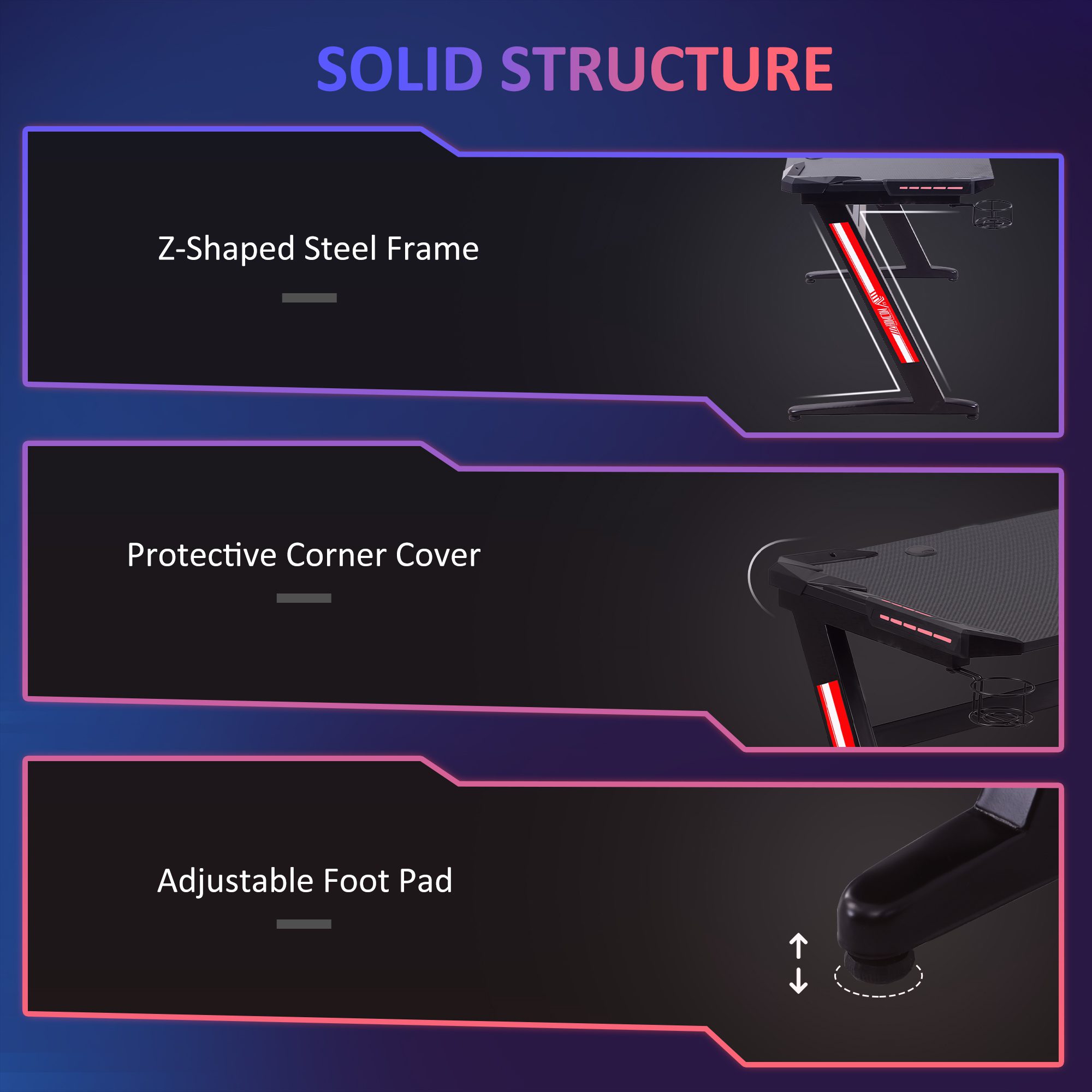 • – Adjustable foot pad to prevent your floor from damaged and keeps desk stable