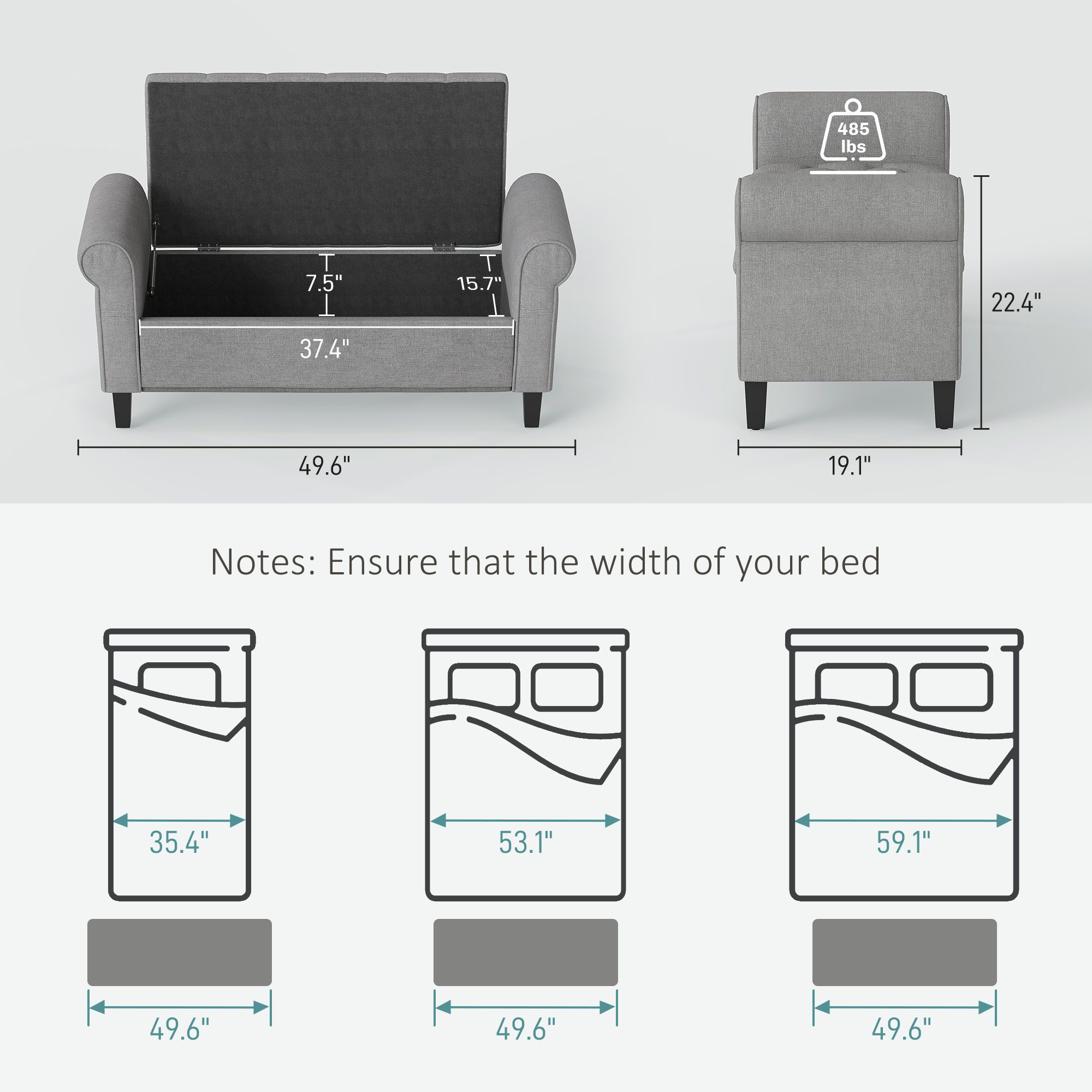 - – Storage Size: 37.5″ W x 15.75″ D x 7.5″ H