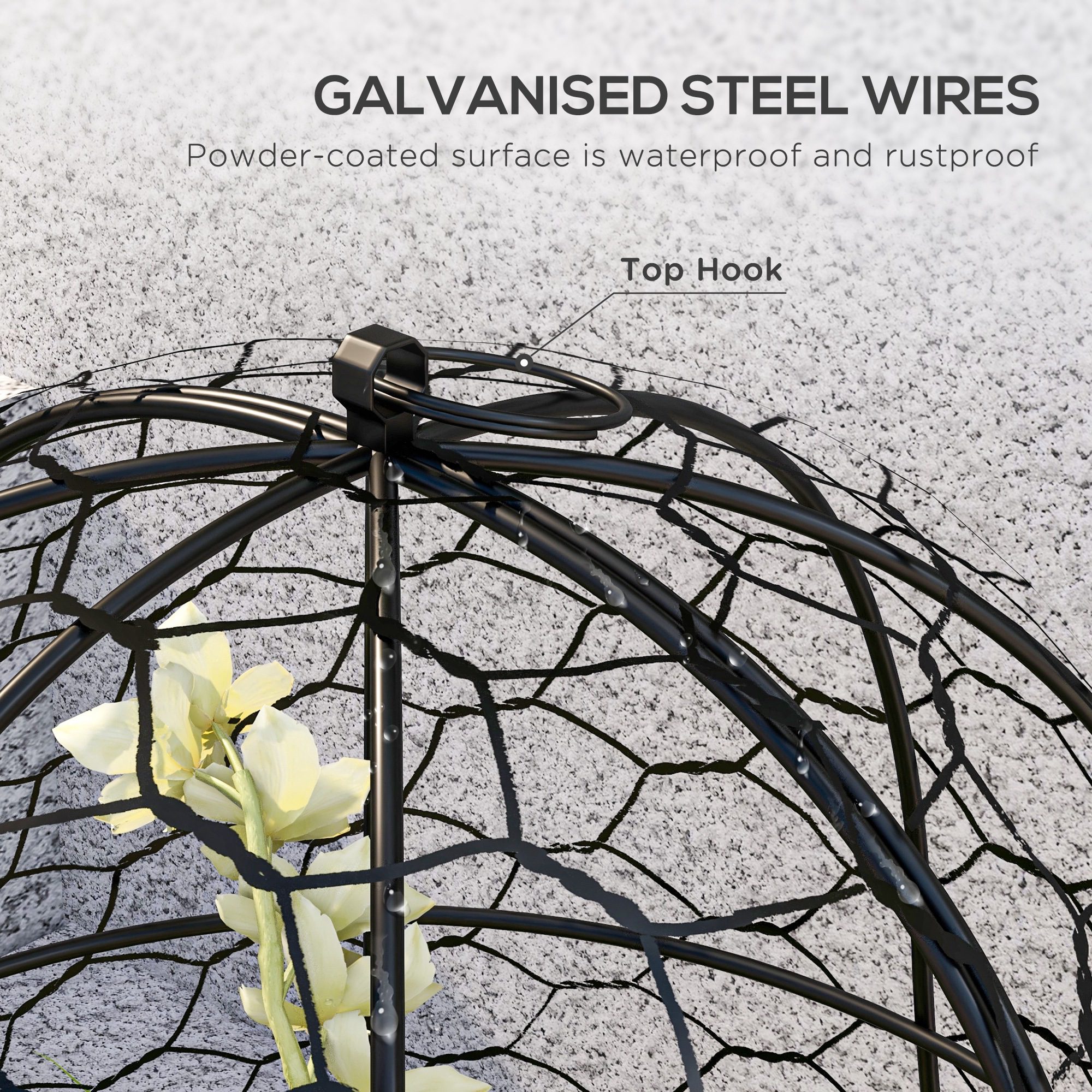 • – Galvanized steel wires with powder-coated finish for a stable frame