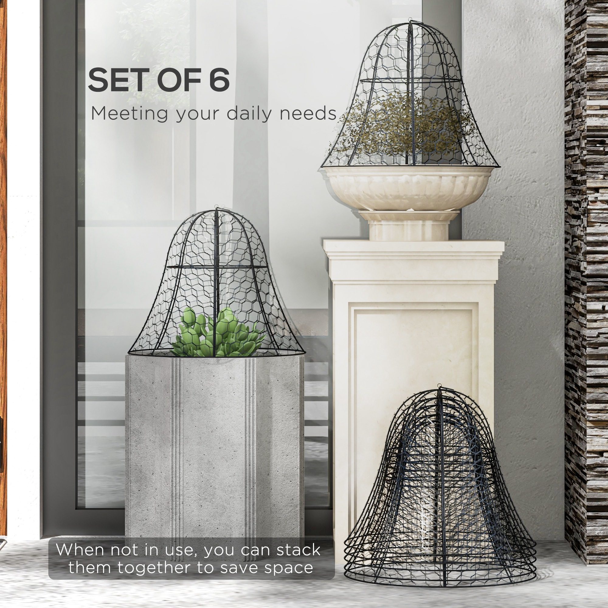 If you’re sick of rabbits and birds gnawing away at your hard work in the garden, an [BRAND NAME] six-piece plant cage set is here to set boundaries. Nurse new seedlings and have plants reach their potential. Steel wire lets in natural light, rain, and airflow while shielding your fruit, flowers, and vegetables inside. A top hook lets you lift your plant protector easily, so you can clip, prune, or collect your crops. No assembly is needed, and they stack to make storage easy.