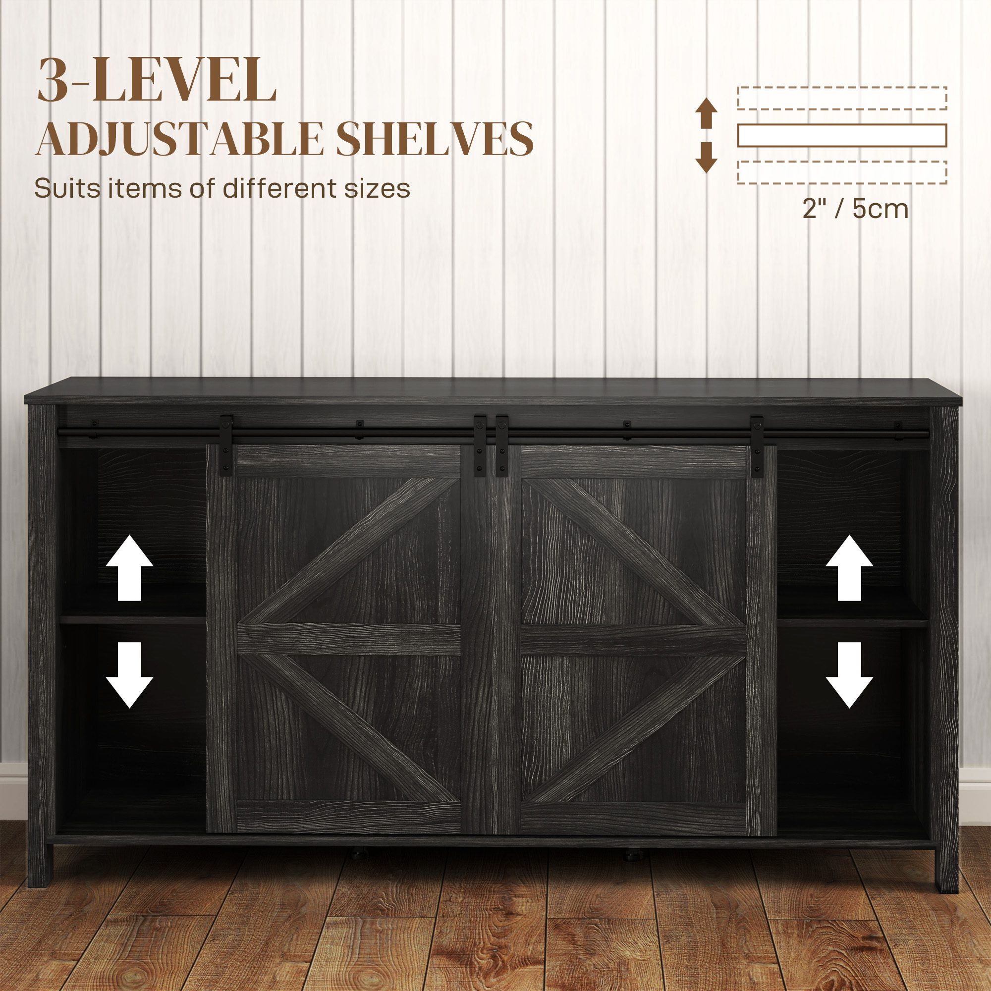 60″ Buffet Cabinet, Farmhouse Sideboard with Sliding Barn Doors, Drawers and Adjustable Shelves, Distressed Dark Gray