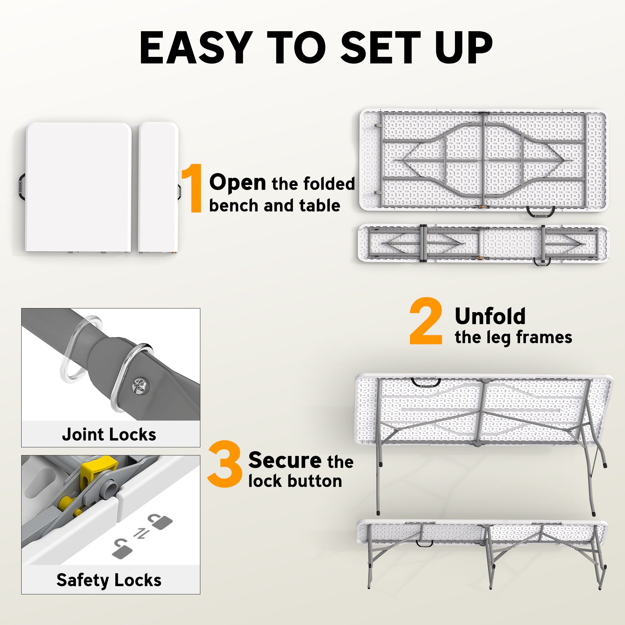Discover the great outdoors with the [BRAND NAME] portable picnic table set! This three-piece set includes a spacious foldable picnic table and two benches, great for family picnics or festival outings. Crafted with a waterproof HDPE benchtop and a corrosion-resistant metal frame, it features joint locks and non-slip pads to ensure safety. Easily portable, this camping furniture set lets you unfold adventure wherever you go!