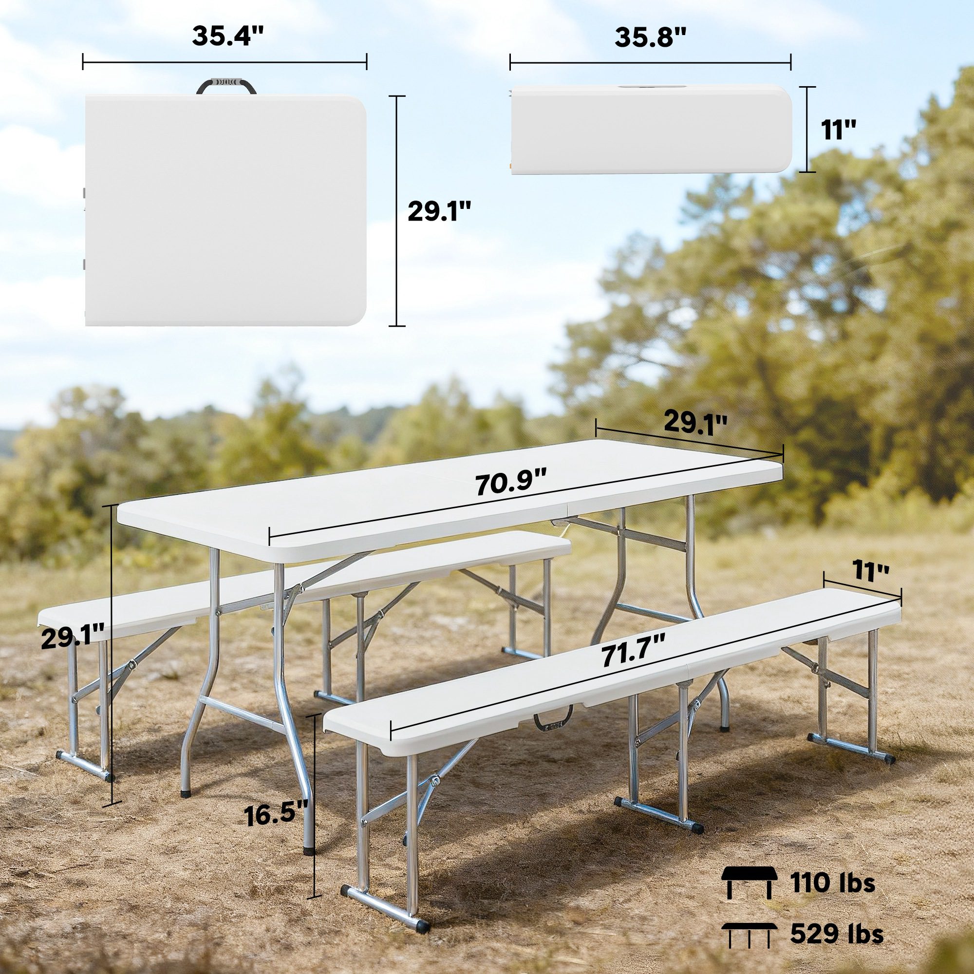 - – Weight Capacity: 529 lbs. (chair), 110 lbs. (table)