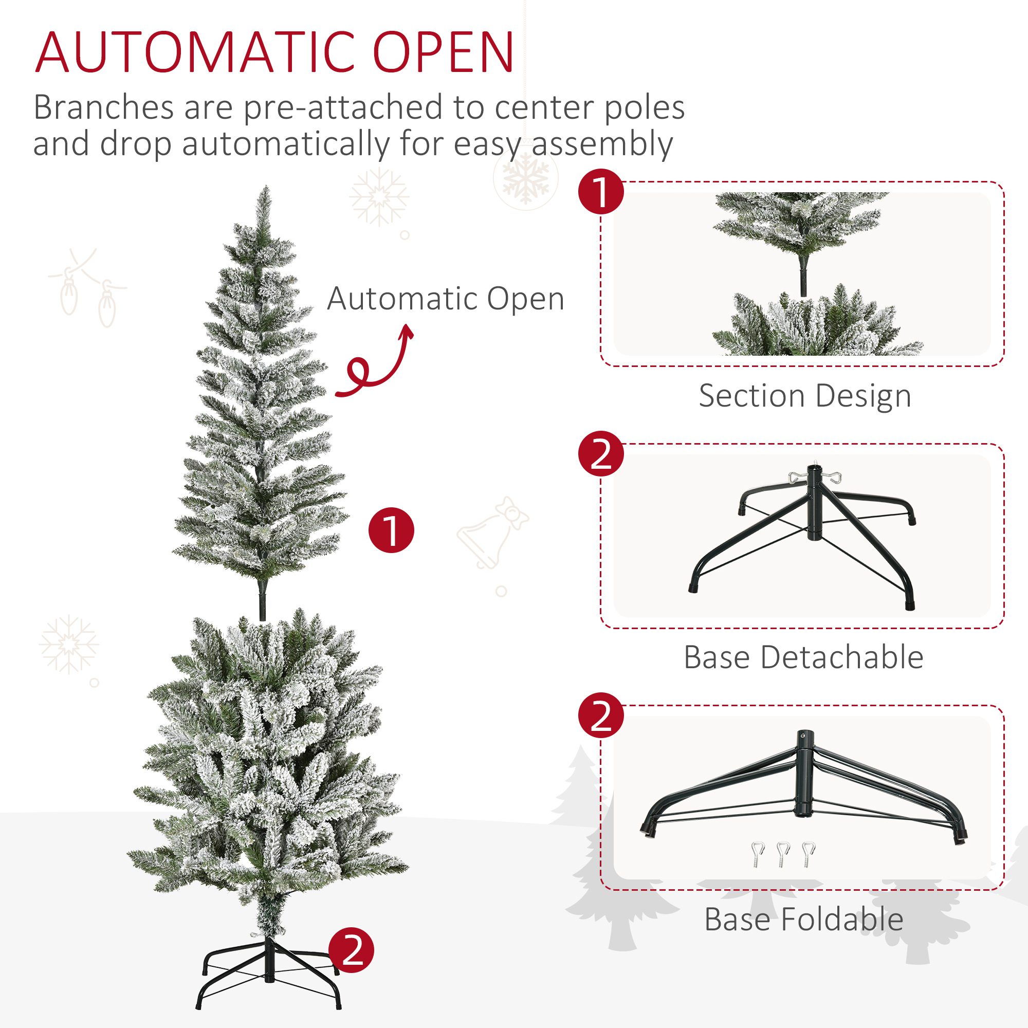 - – Branches are pre-attached to center poles and drop automatically for easy assembly