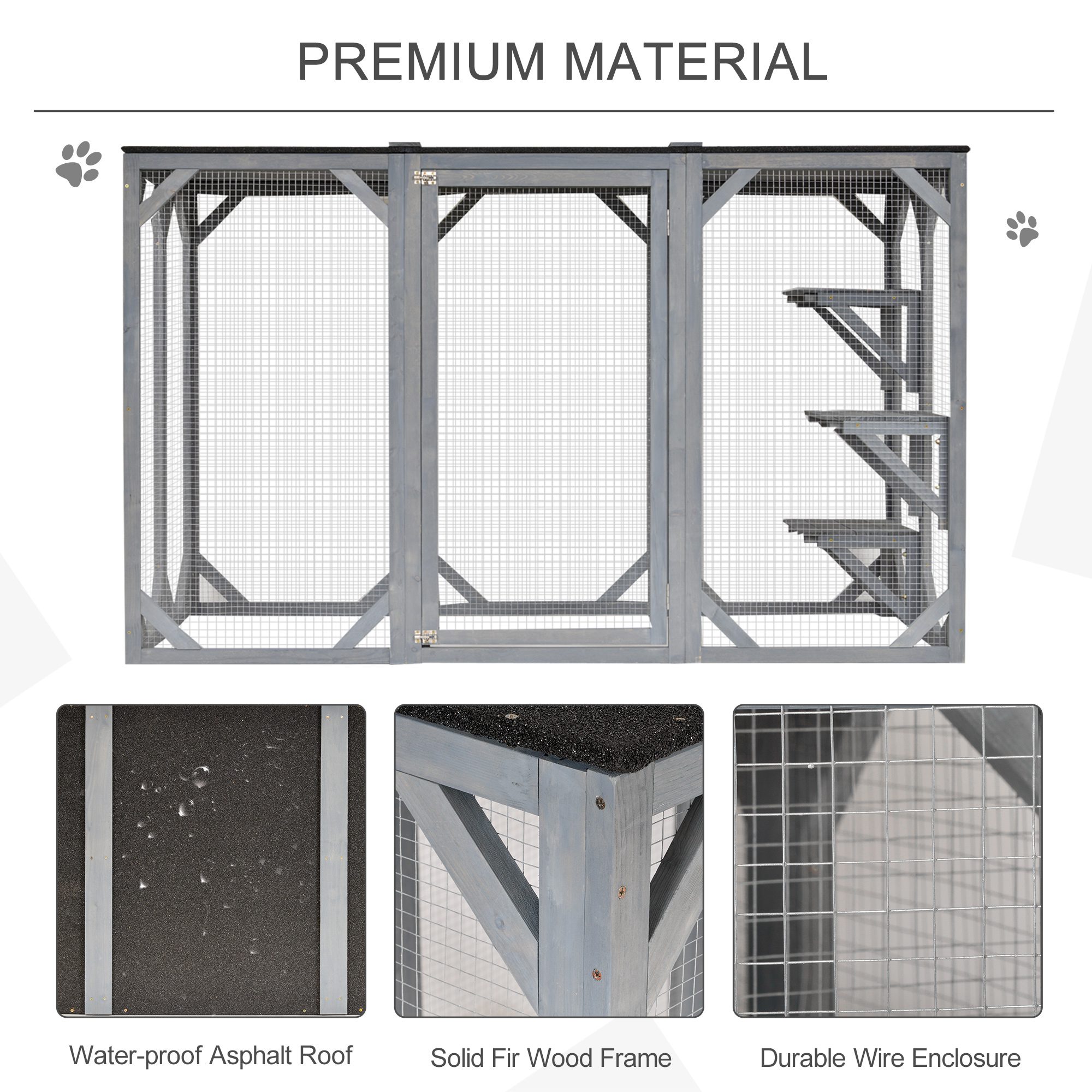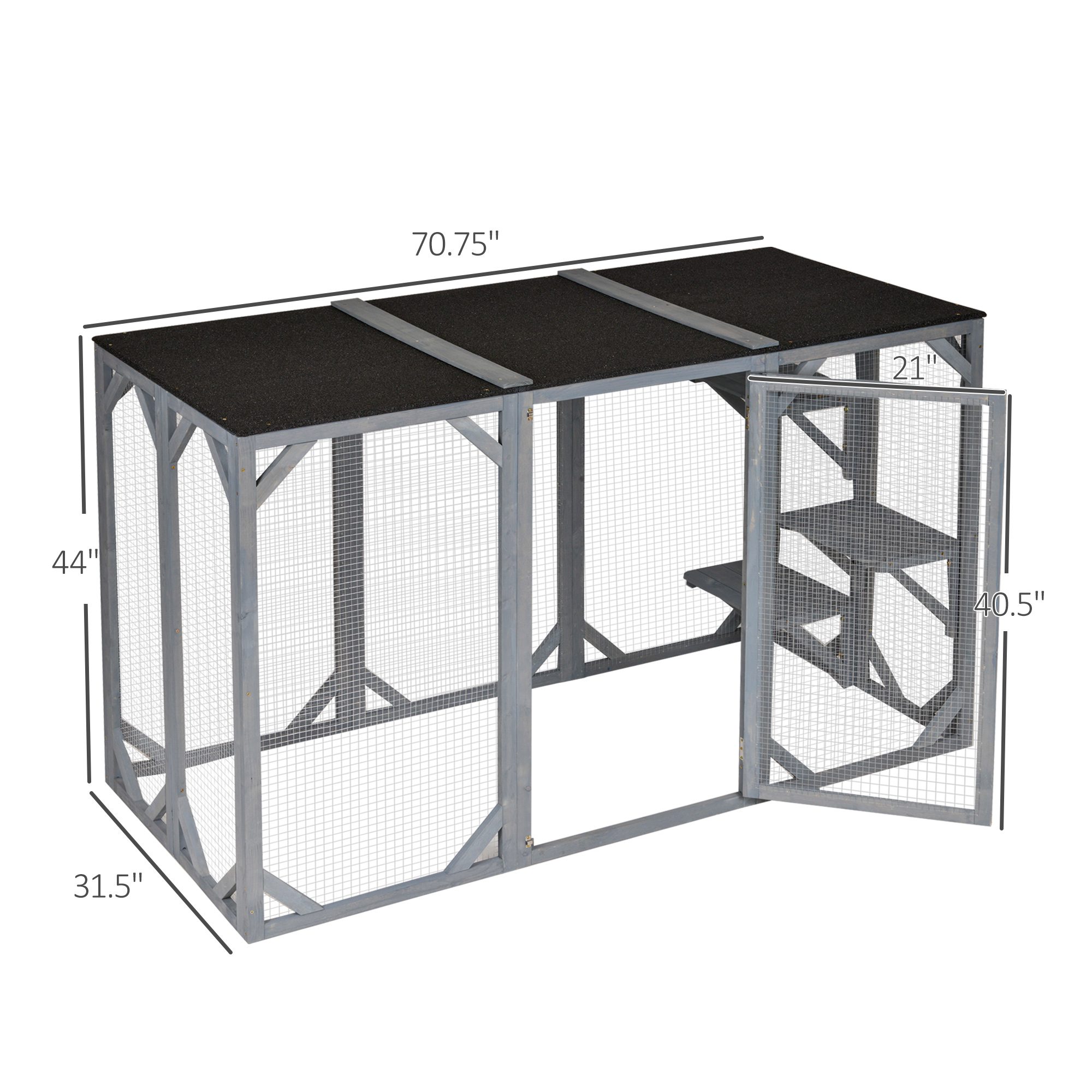 This [BRAND NAME] catio allows cats to enjoy the fresh air and stay protected from hidden dangers. Our cat enclosure serves as both a secure and comfortable sanctuary for your furry family members. Three platforms allow your cats to climb and lounge while the roof has been covered with asphalt, protecting from weather elements. This cat playpen can establish or complete an outdoor setup and keep your furry friends safer and more comfortable outside.