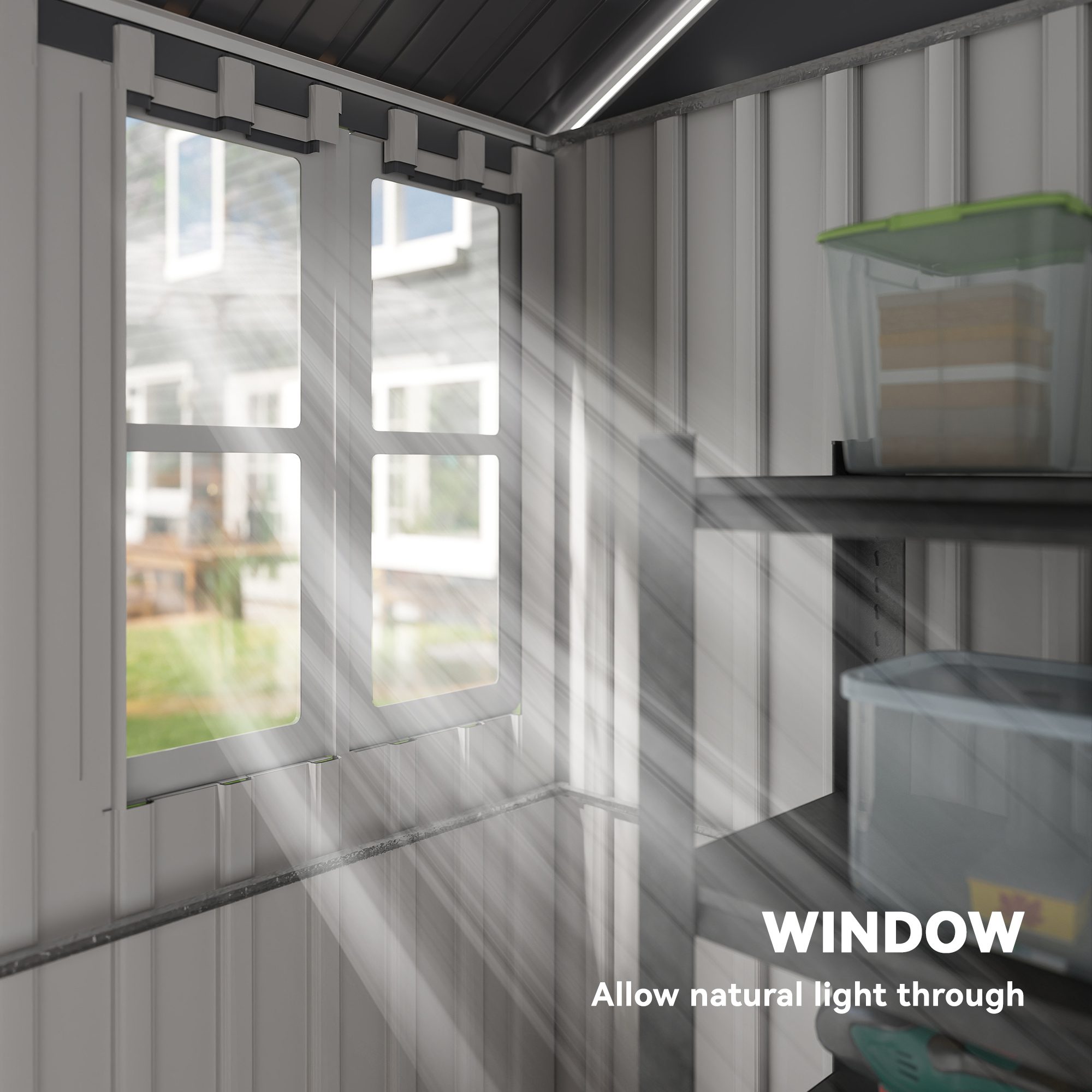 The metal storage shed from [BRAND NAME] is an excellent addition to your outdoor space, providing efficient tool organization. With 48 ft² of interior space, it can also serve as a storage house for bikes or motorcycles. The storage shed features double doors for easy access, a window for natural light, two side air vents to promote airflow, and a sloped roof preventing water buildup. For added security, it is equipped with a latch lock. Please note that the foundation is not included.
