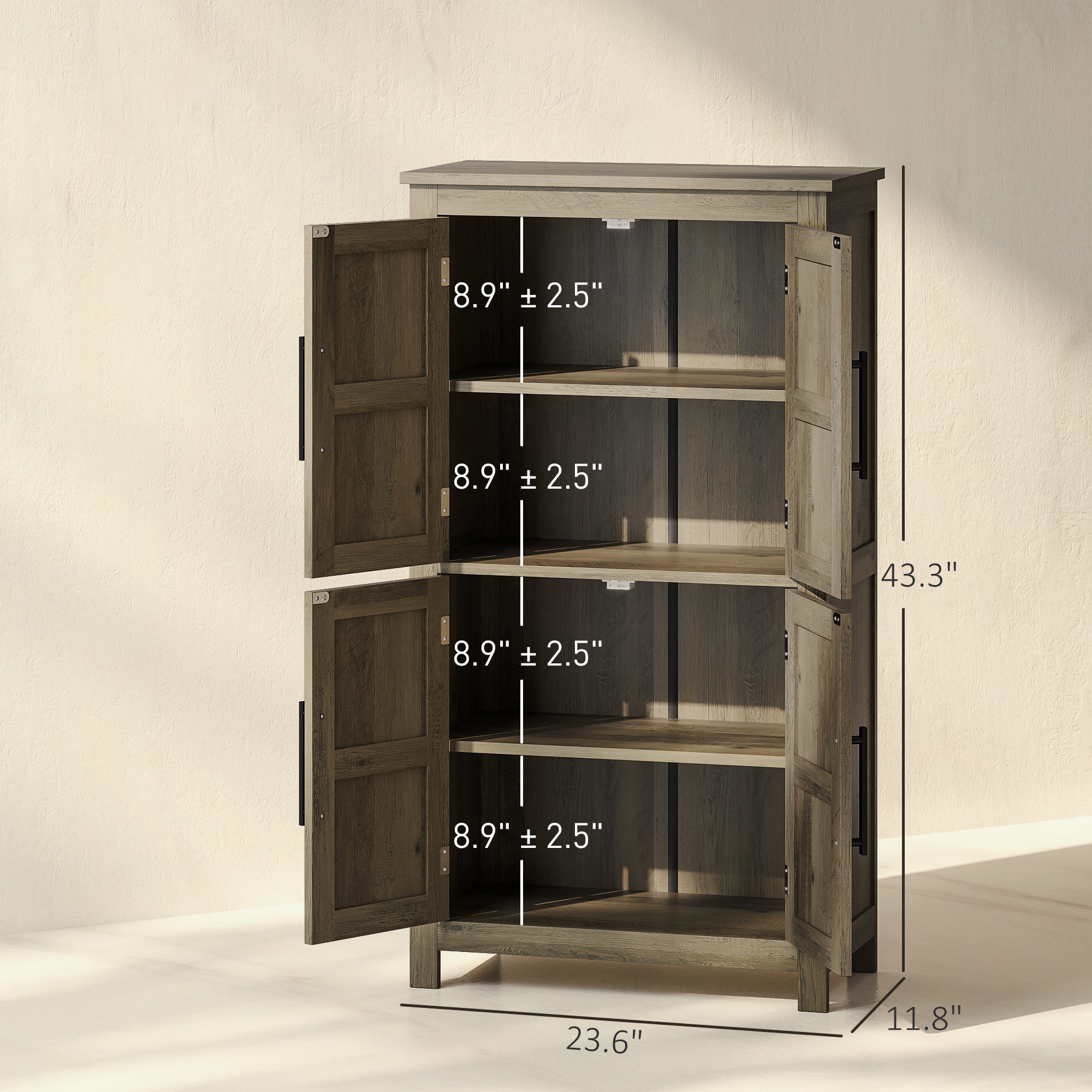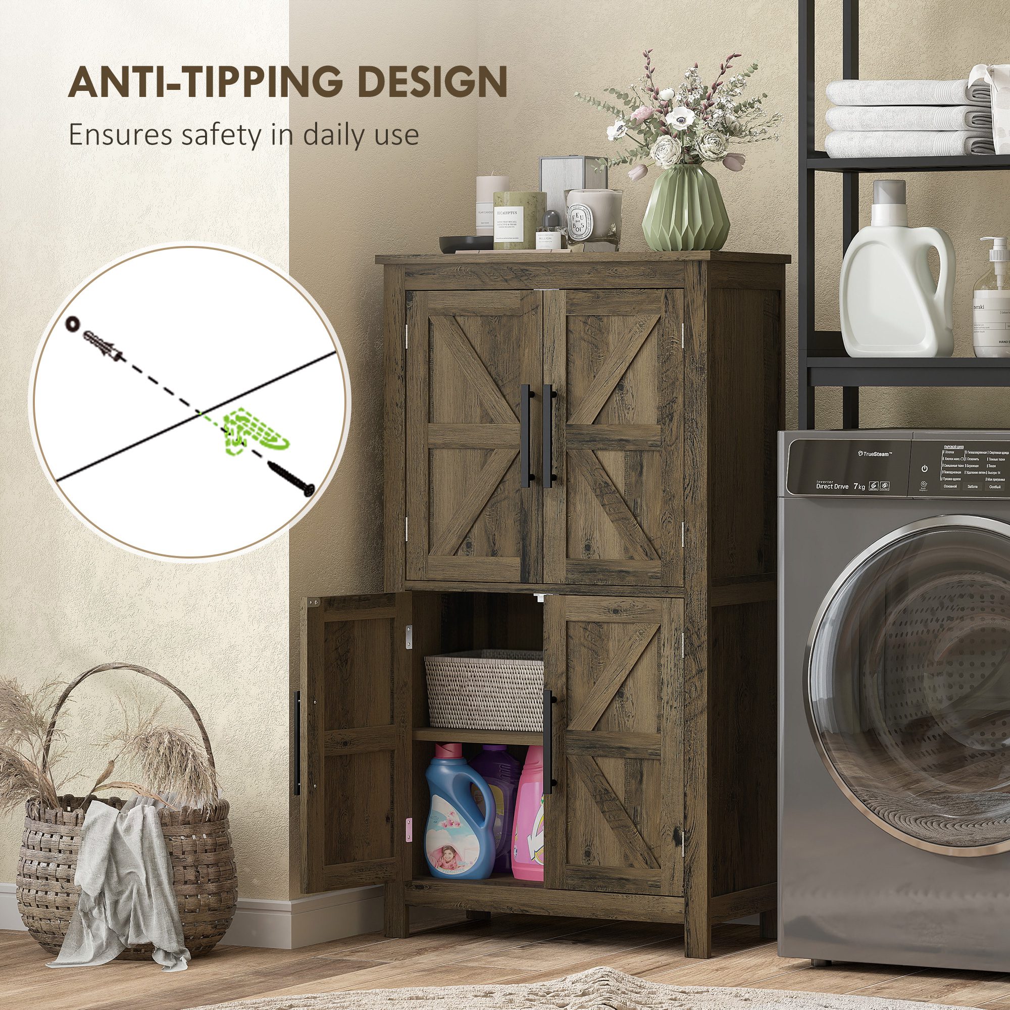 Transform your home’s look into stylish, functional spaces with the [BRAND NAME] bathroom storage cabinet. Featuring a four-tier shelf nestled in two cabinets and three-level adjustable shelving, this bathroom cupboard promises neat organization. Flaunting farmhouse charm with barn doors and black metal handles, it’s a chic addition to bathrooms, kitchens, or entryways, optimizing corner space effortlessly.