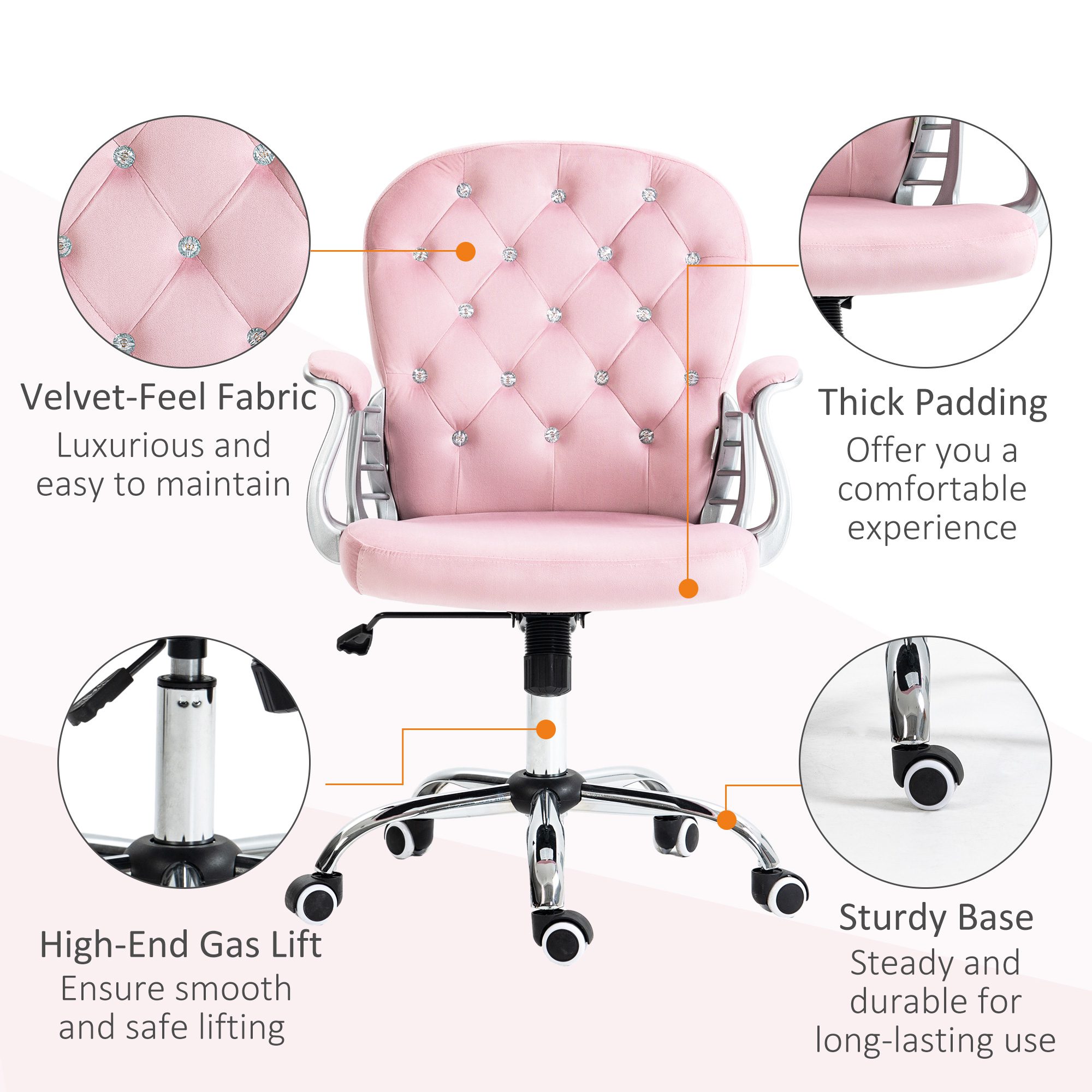 Button Tufted Desk Chair, Home Office Chair with Padded Armrests, Adjustable Height and Swivel Wheels, Pink