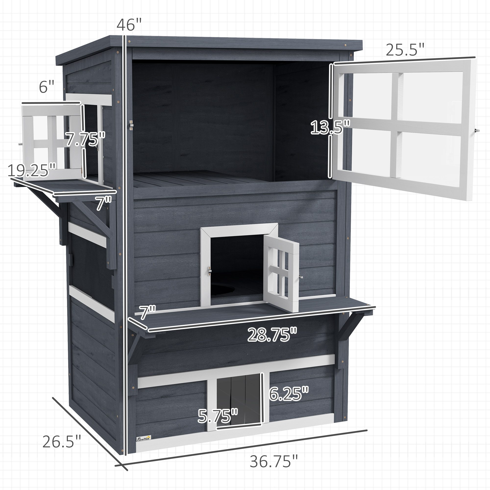 - – Door Dimensions: 5.75″ W x 6.25″ H (bottom), 7.25″ W x 7.75″ H (middle), 6.25″ W x 7″ H (side sliding door), 25.5″ L x 12.5″ W (top acrylic door), 6″ W x 7.75″ H (side door)