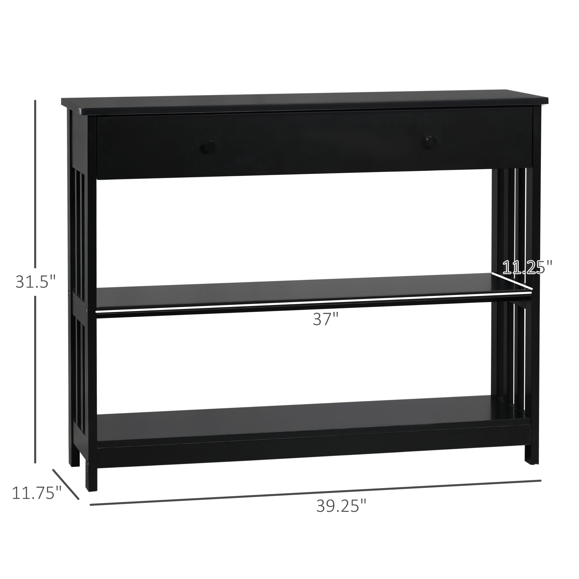 Console Hallway Table with Extra Wide Pull Out Drawer, 2 Open Shelves and Slatted Wood Frame Design, Black