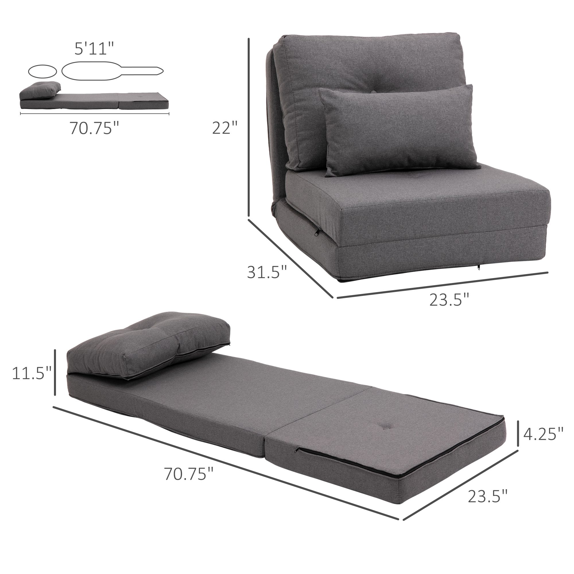 - – Overall Size: 23.5″ W x 31.5″ D x 22″ H (floor sofa), 70.75″ L x 23.5″ W x 11.5″ H (sofa bed)