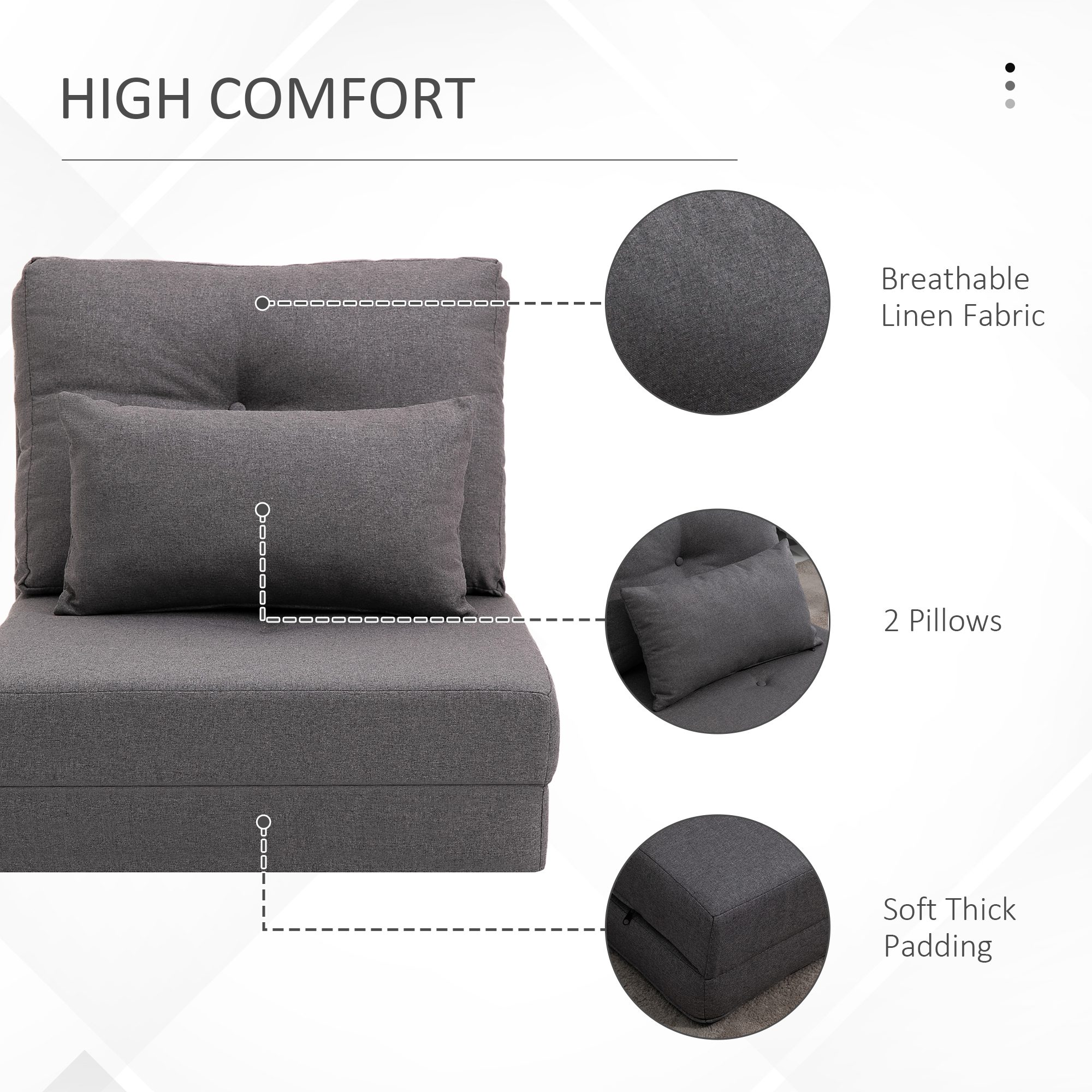 - – High-density sponge padding and two pillows for an excellent sitting experience