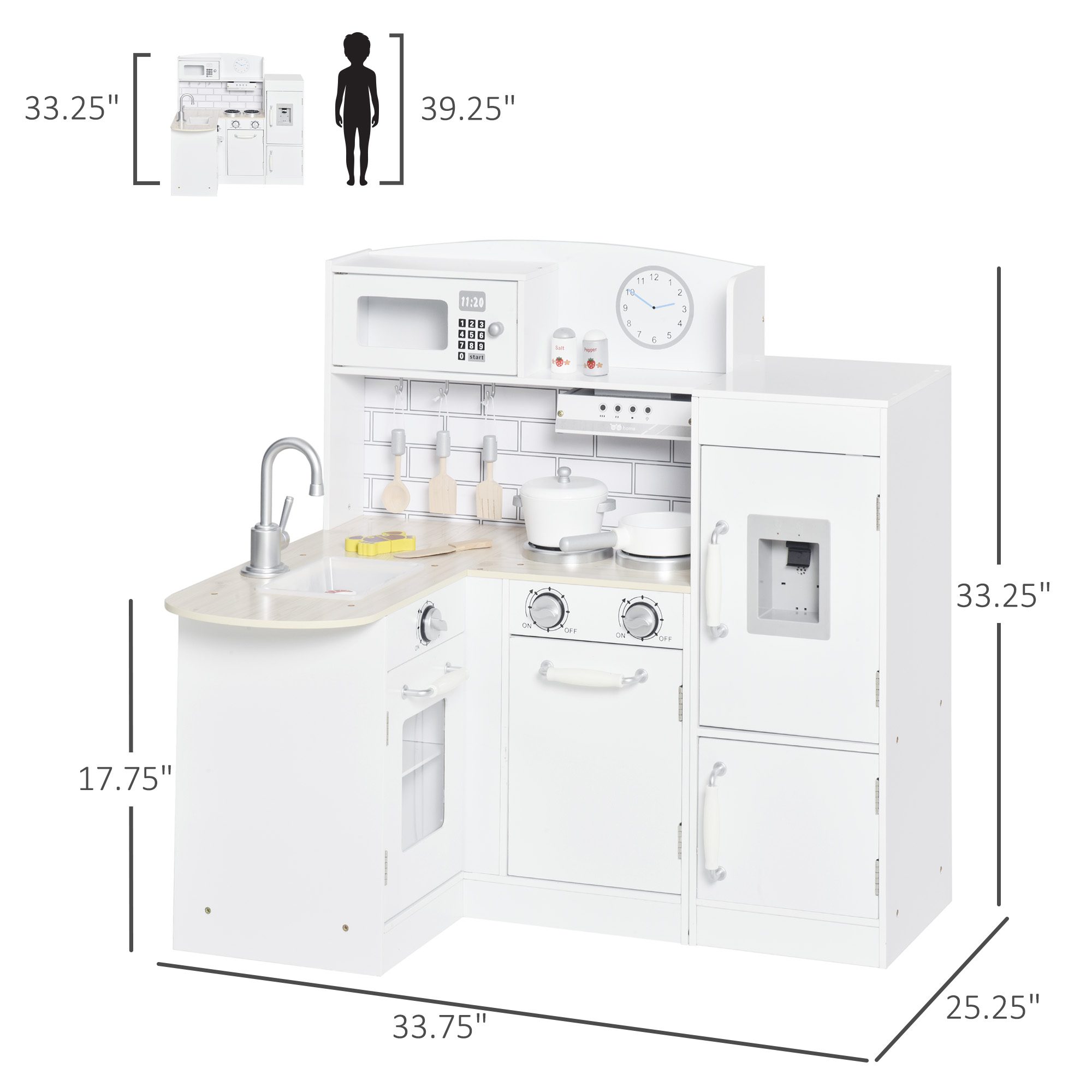 Corner Kids Kitchen Playset, Wooden Pretend Toy Kitchen Set with Drinking Fountain, Microwave, Fridge and Accessories, Pretend Play Kitchen for 3+ Years, White