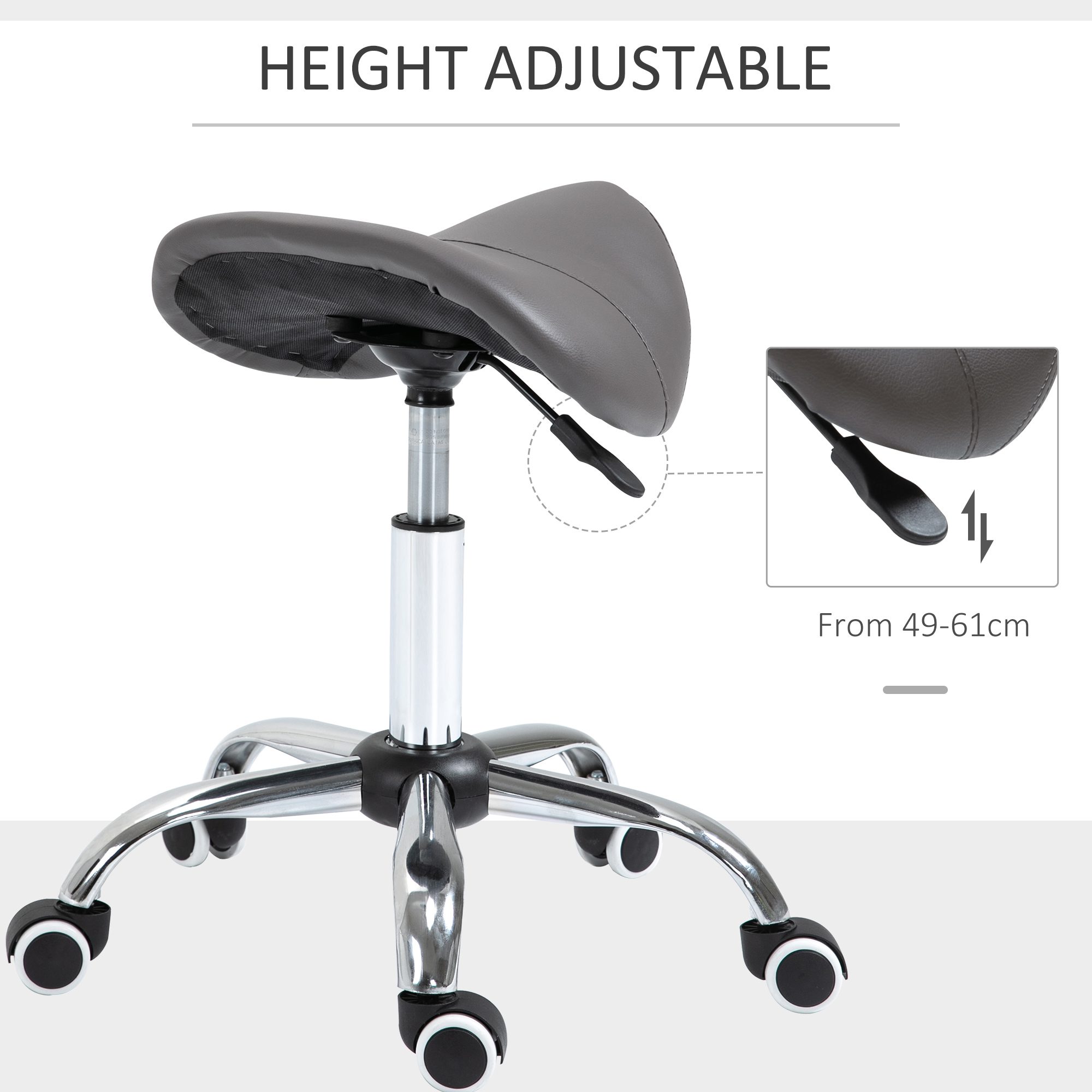 Ideal for salons, tattoo parlors, architects, and doctor or dentist offices, this Adjustable Rolling Stool will provide support, stability, and freedom of movement during long hours of seated work. A fully adjustable hydraulic lift lets you find a comfortable height while working and is especially handy when working with clients of varying heights in salons or tattoo parlors. The high-density saddle seat cushion helps to encourage good posture and support your back and legs while the open concept of the stool allows for full movement of your arms and hands while seated. The full 360-degree swivel and dual wheel casters allow this stool to glide easily across floors without having to stand up.