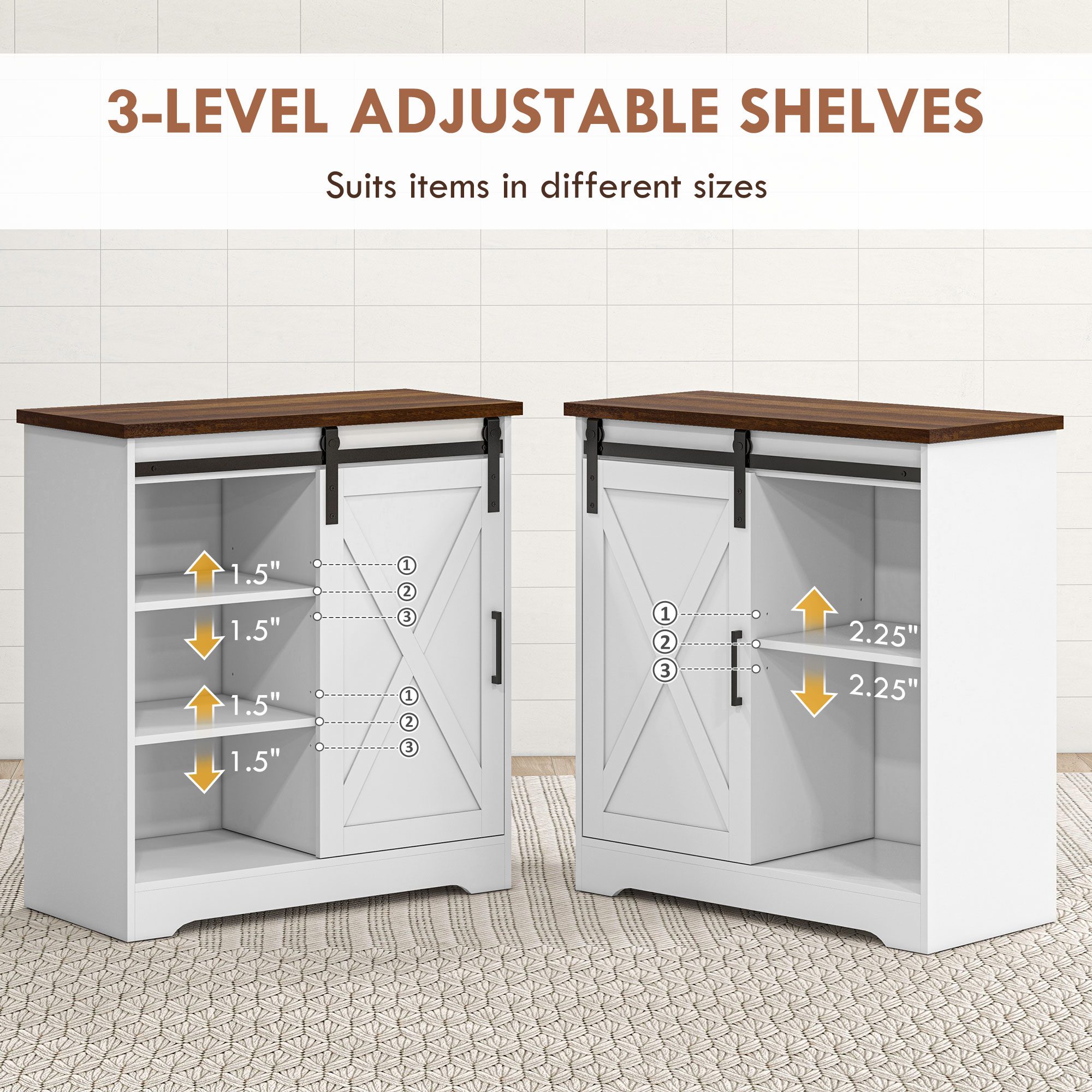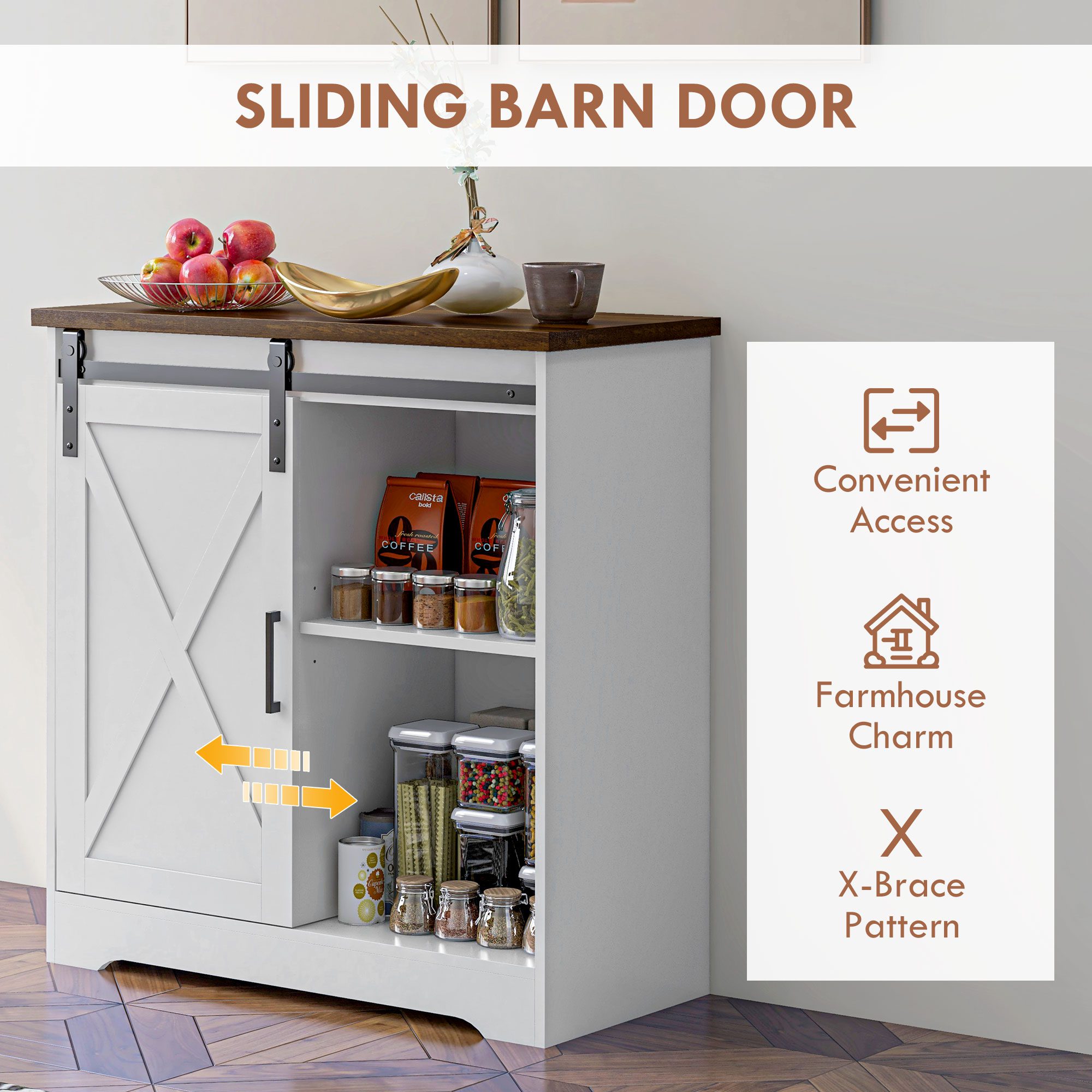 Revamp your living space with a [BRAND NAME] farmhouse sideboard buffet. Organize your dinnerware, pots, and pans using the five compartments. You can tailor to our storage needs with three adjustable shelves inside the buffet. This kitchen sideboard has a sliding barn door and is bound to instantly upgrade your dining room, living room, or entryway with rustic charm and versatile storage. Whatever your storage needs, this buffet cabinet will house all your essentials with functional finesse.
