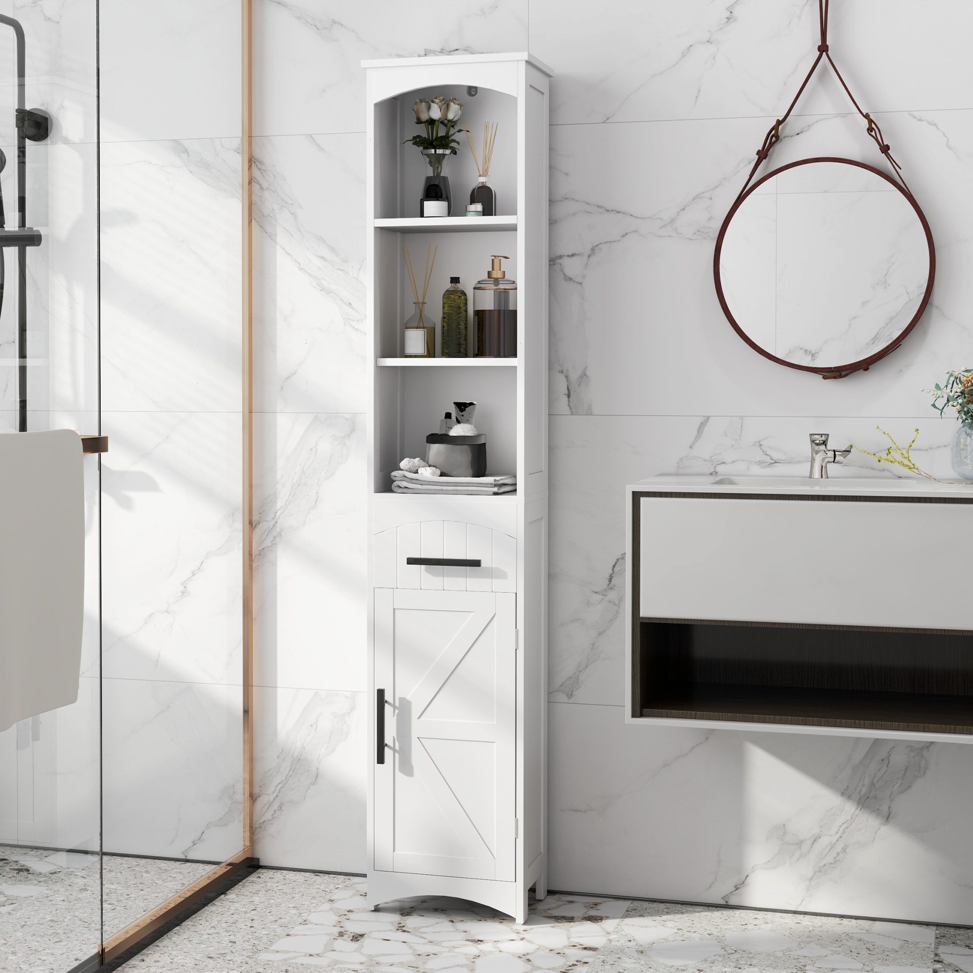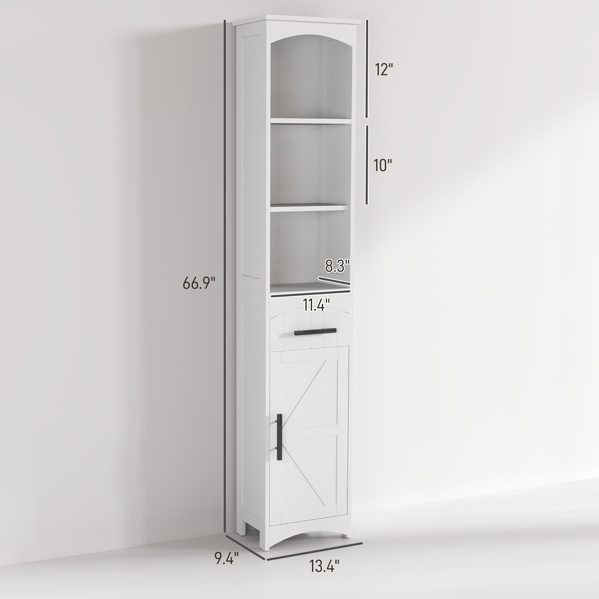 Farmhouse Tall Slim Bathroom Storage Cabinet with Recessed Drawer, Narrow Cabinet with Barn Door, White