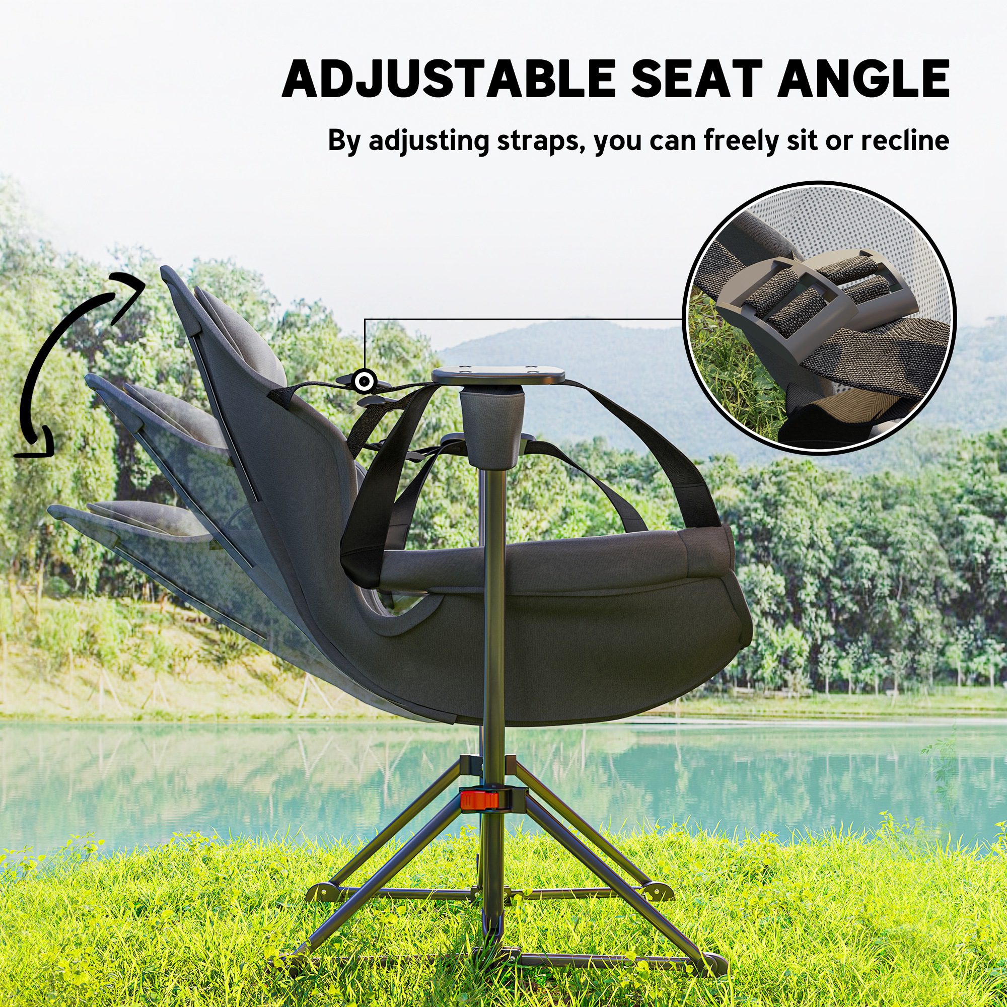 • – Adjustable strap lets you recline at various angles comfortably