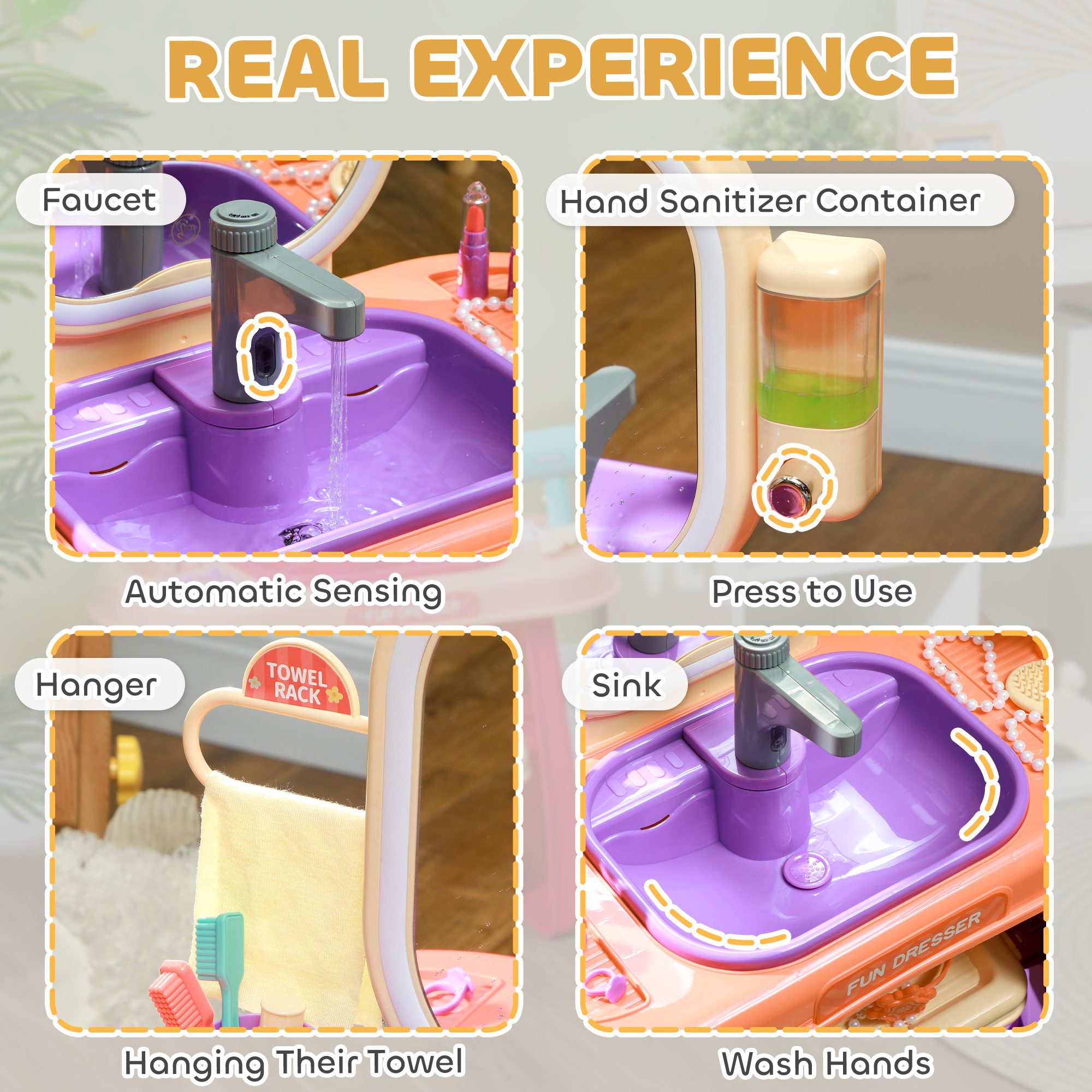 Transform your kid’s playtime into a magical experience with the vanity for girls. This kid’s makeup vanity is a wonderland for any aspiring princess, featuring a mirror with enchanting LED lights and a faucet that releases water and plays music. This delightful set also includes a spot for towels and a hand sanitizer container, ensuring fun meets function in a safe play space.