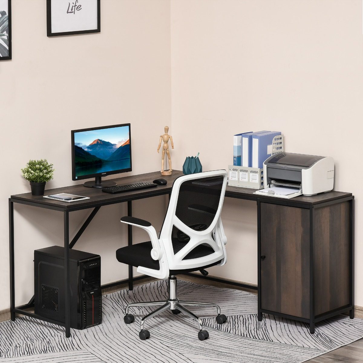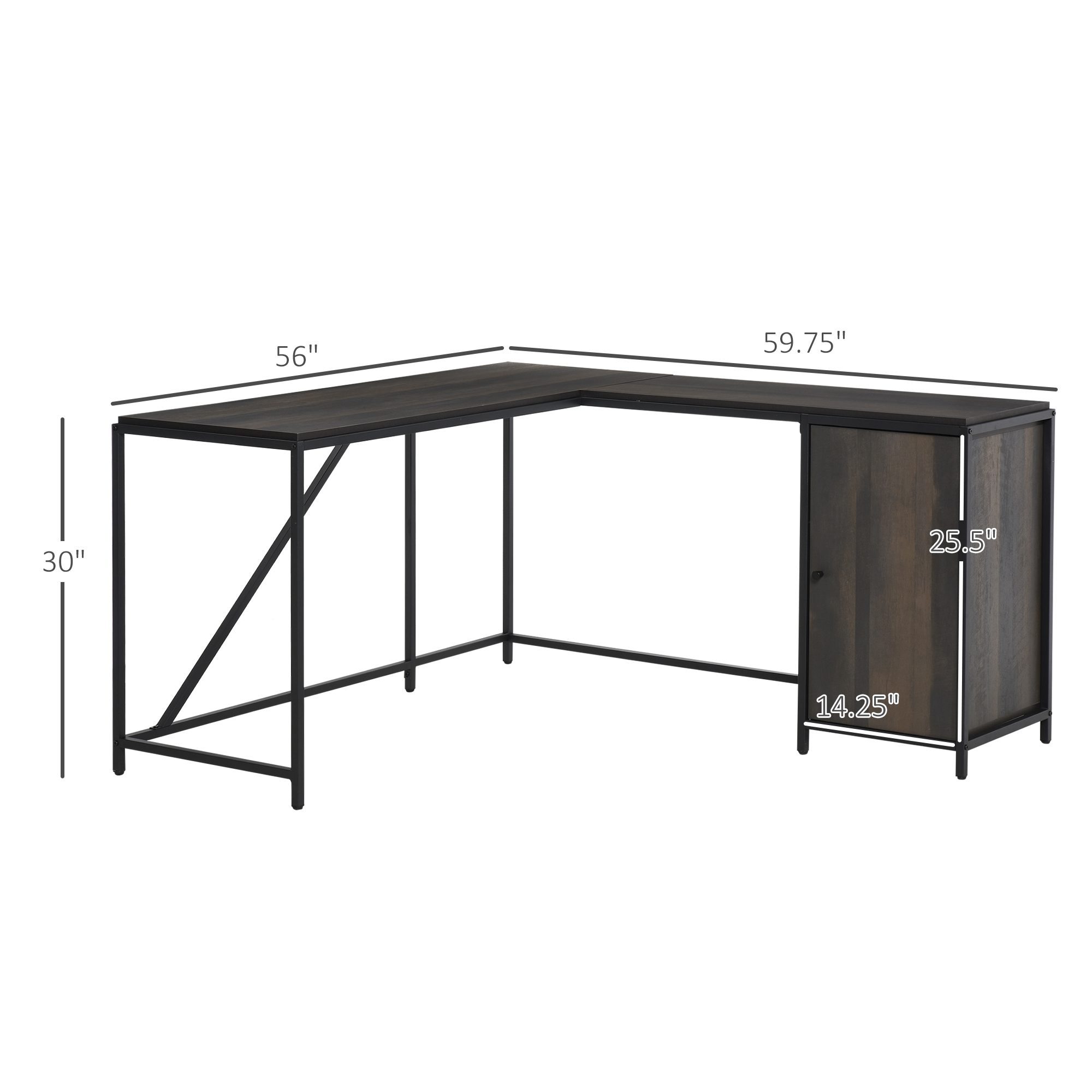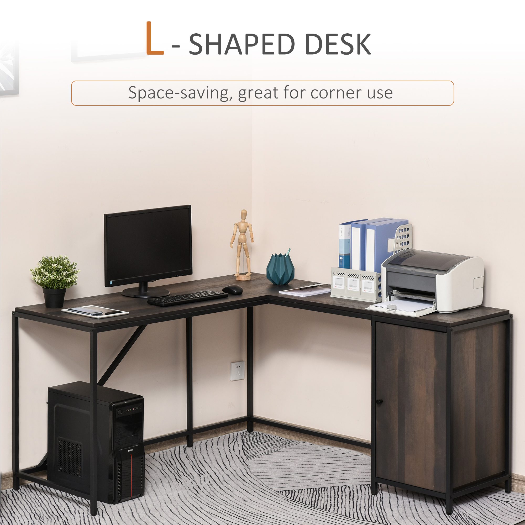 The L-shaped corner desk is a lovely piece of furniture to have that is both elegant and convenient. Industrial style with metal frame will perfectly match with your home décor. The large workspace and a cabinet with an adjustable shelf help for storing your laptop, monitor or printer, files, and books. Create a stylish working station with this unique piece from .