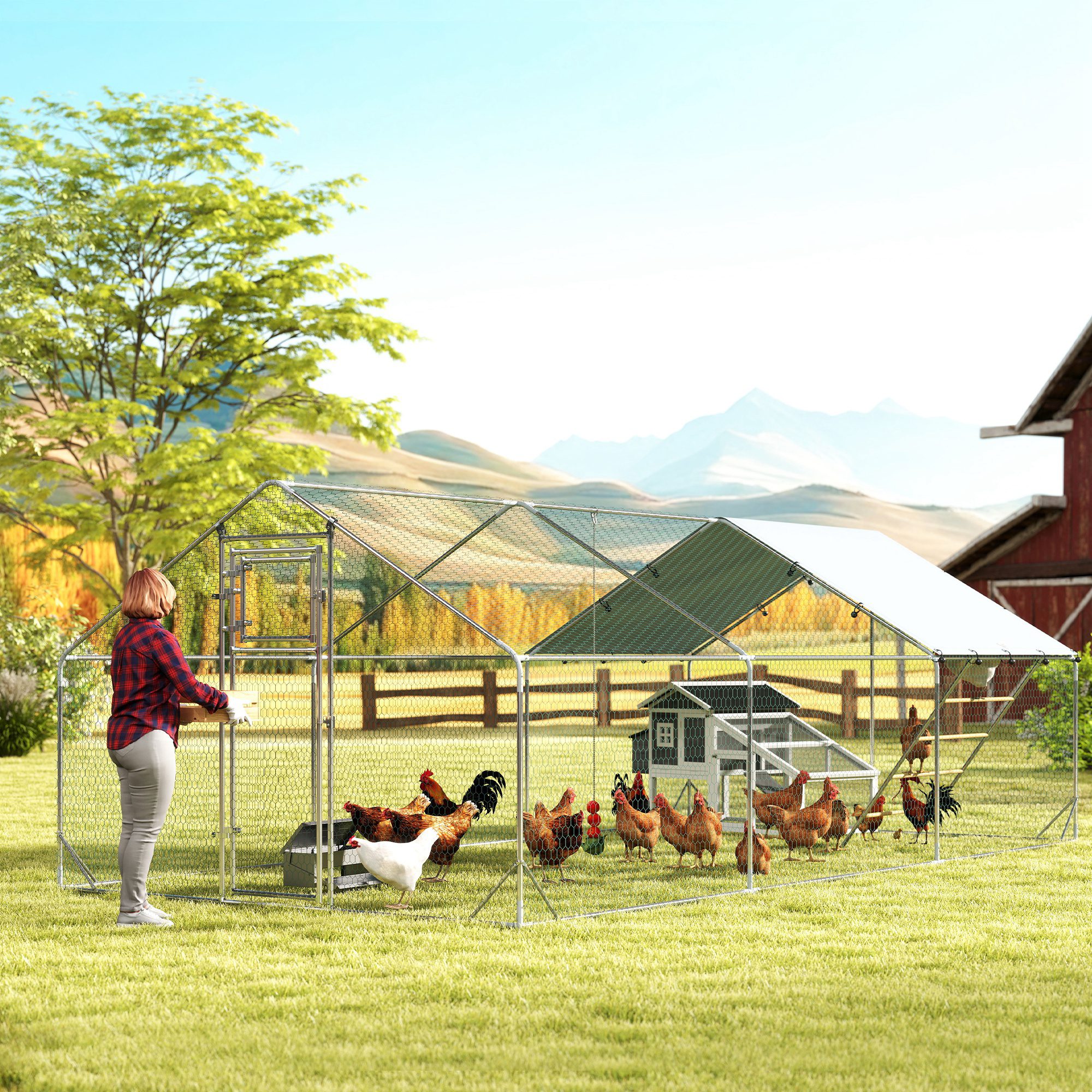 Metal Chicken Run w/ Waterproof & Anti-UV Cover, Feeding Door, Hanging Feeder, for 18-24 Chickens, 9.8' x 19.7' x 6.4'