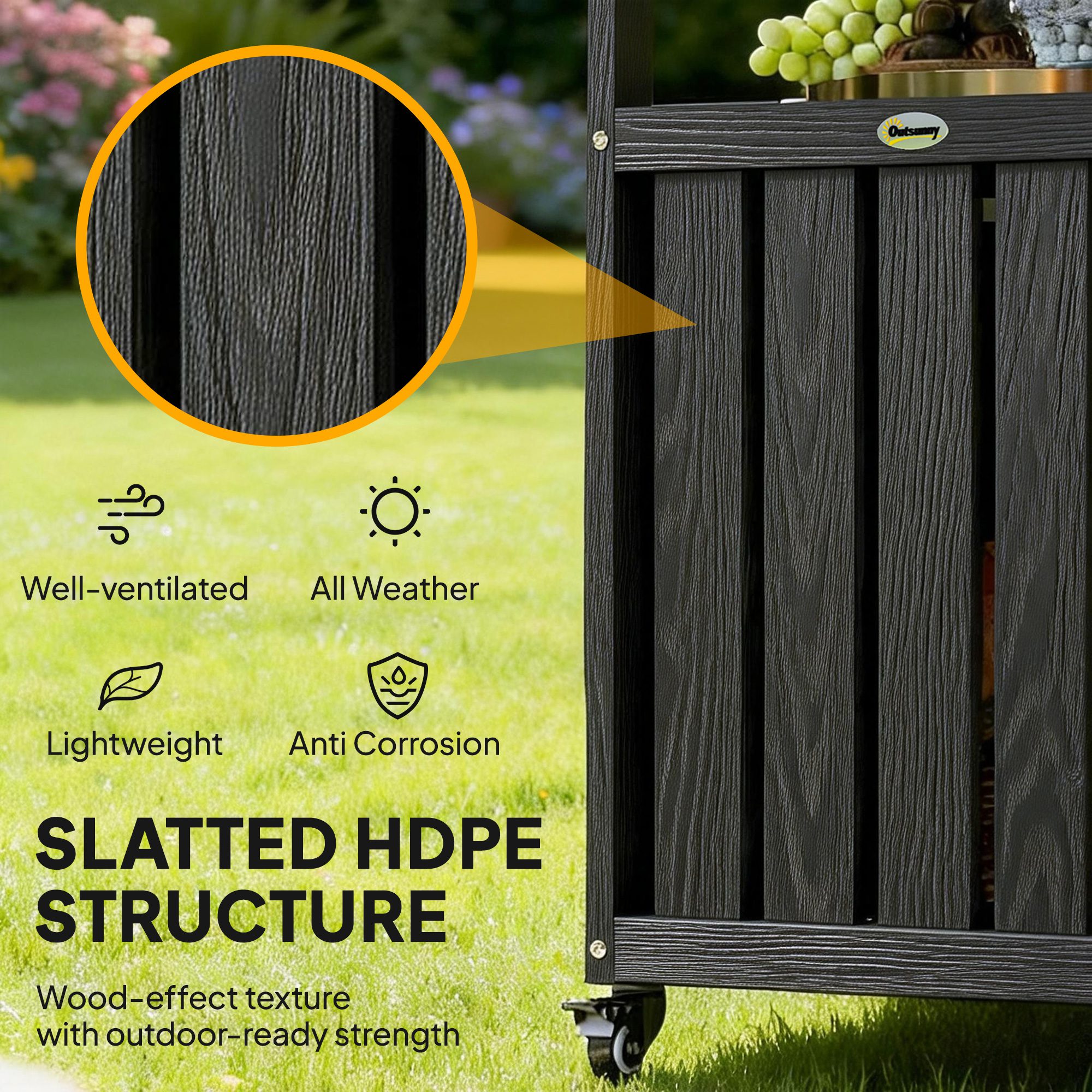 Take entertaining to the next level with this [BRAND NAME] outdoor serving cart. This outdoor rolling cart is your go-to for indoor or outdoor cooking and fun, featuring a sleek stainless steel tabletop and a slatted HDPE structure. A storage cabinet, an open shelf, a side rack, bars, and hooks give you many storage options. Easily portable with large wheels, this beverage bar cart is excellent for meal prep and serving at picnics, BBQs, or family get-togethers. Get on a roll with [BRAND NAME].