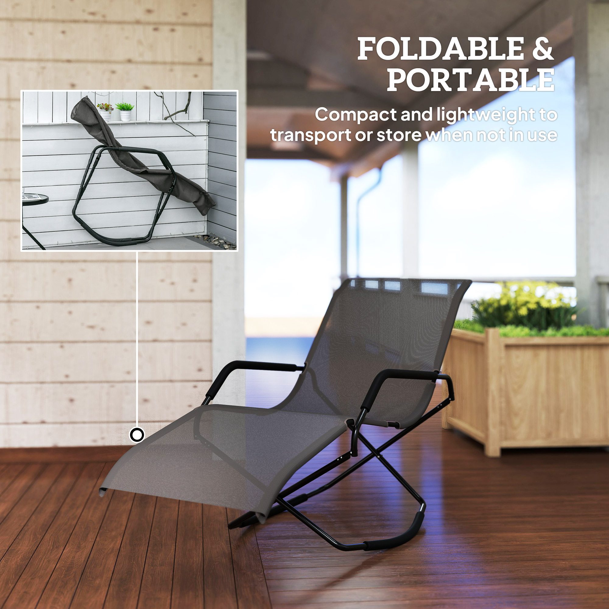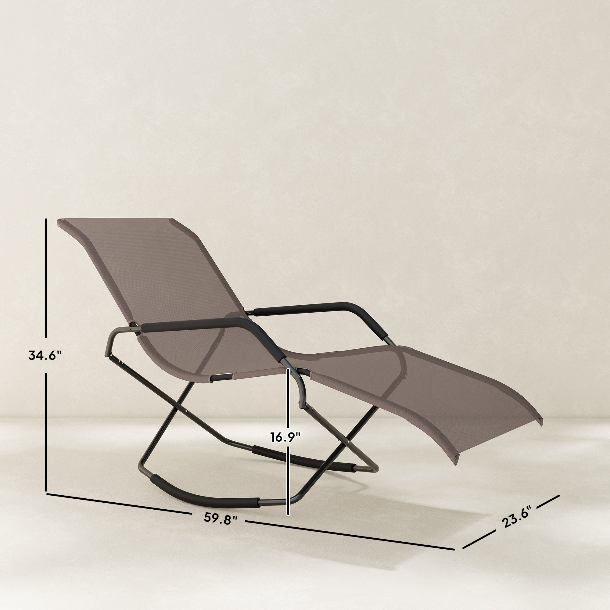 You want an outdoor rocker, but so many options just look stiff. Only a pool chair seems to provide that laid-back chaise-sitting style, and you’d prefer it to fold for the road. Have it all. [BRAND NAME] offers a folding outdoor rocking chair with a forming-fitting chaise lounge build. Armrests sit to each side. Take it from the backyard to the beach; its folding design is compact and easy to move. Sway back and forth by the pool or patio. Your next tanning session may turn into a nap.