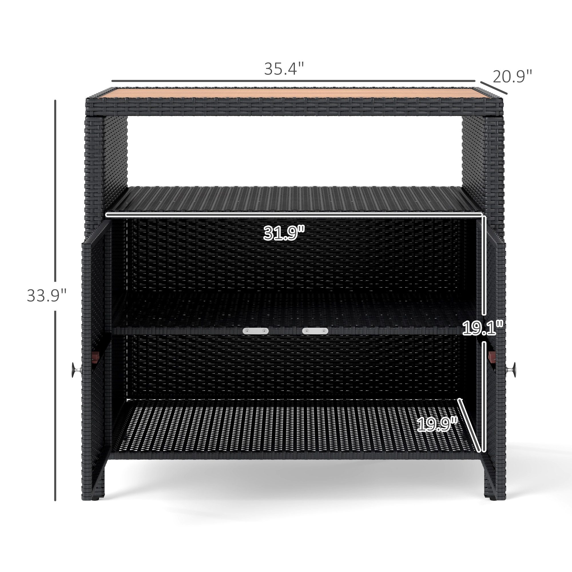Transform your poolside into a resort-like retreat with [BRAND NAME]’s outdoor storage cabinet. Designed for convenience, this patio bar table offers you easily accessible storage for food, beverages, glasses, and more. Store clean towels out of sight, keep poolside essentials like floaties, suntan lotion, and goggles easily accessible on the shelf. Crafted with PE wicker wrapped around a stable steel frame, this outdoor kitchen island is UV and weather-resistant, making it great for use year-round.