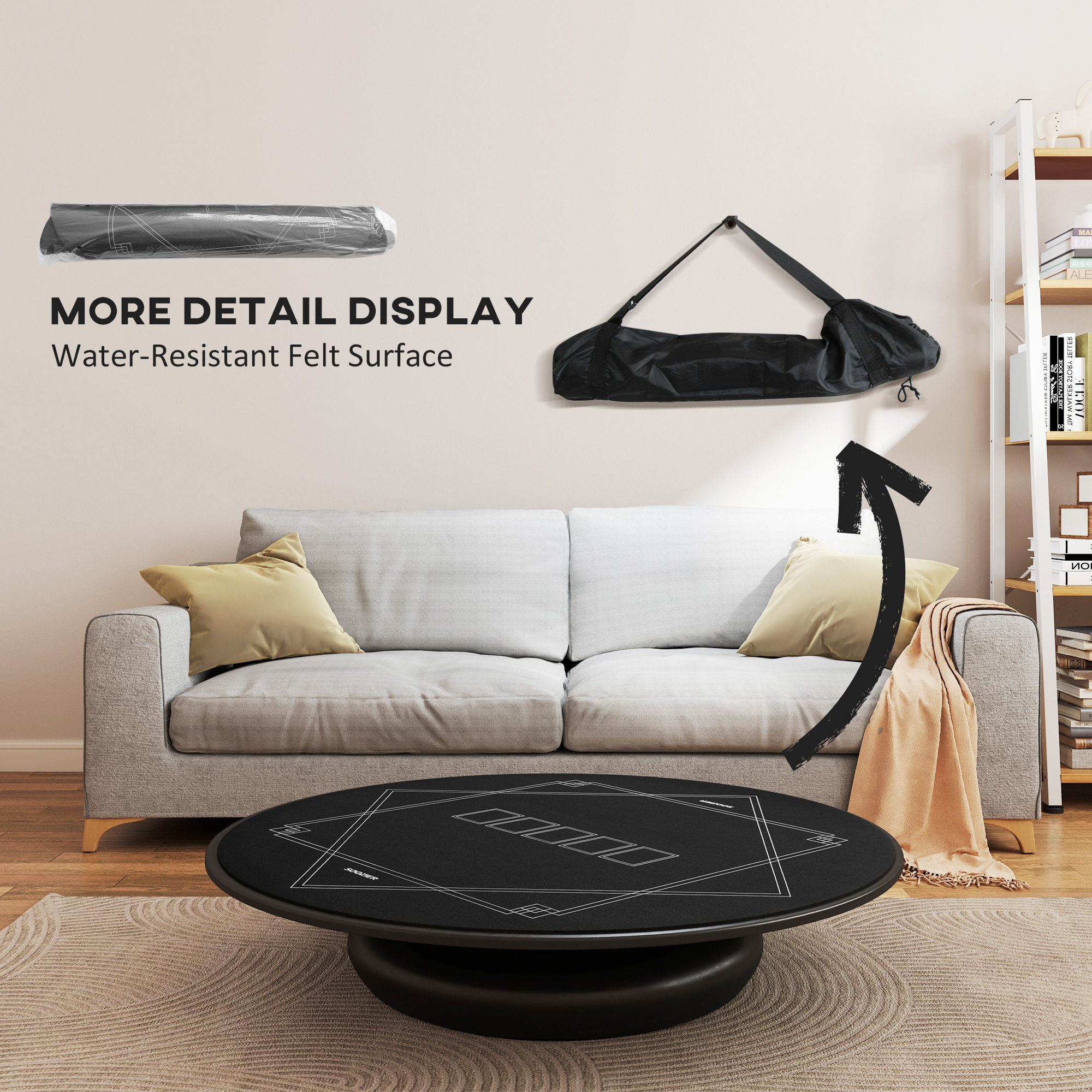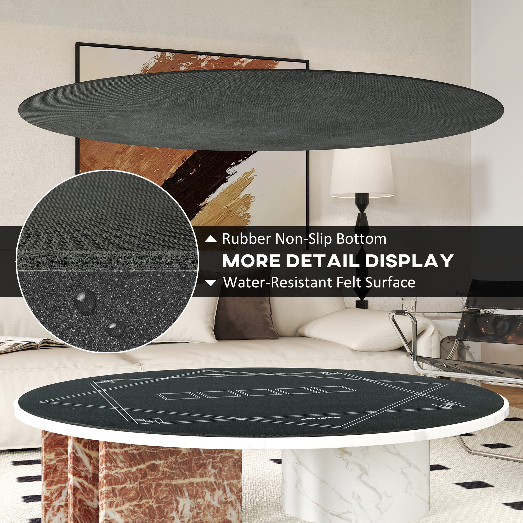 Transform any table into a poker haven with the poker mat! Designed for four players and measuring 5 mm thick, this poker table top offers comfortable and convenient use during your game time. It’s crafted from wear-resistant rubber with a non-slip design for stability. Enjoy the comfort of its soft, water-resistant felt surface. Roll it up, tuck it into the carrying bag included, and take the game wherever you go!