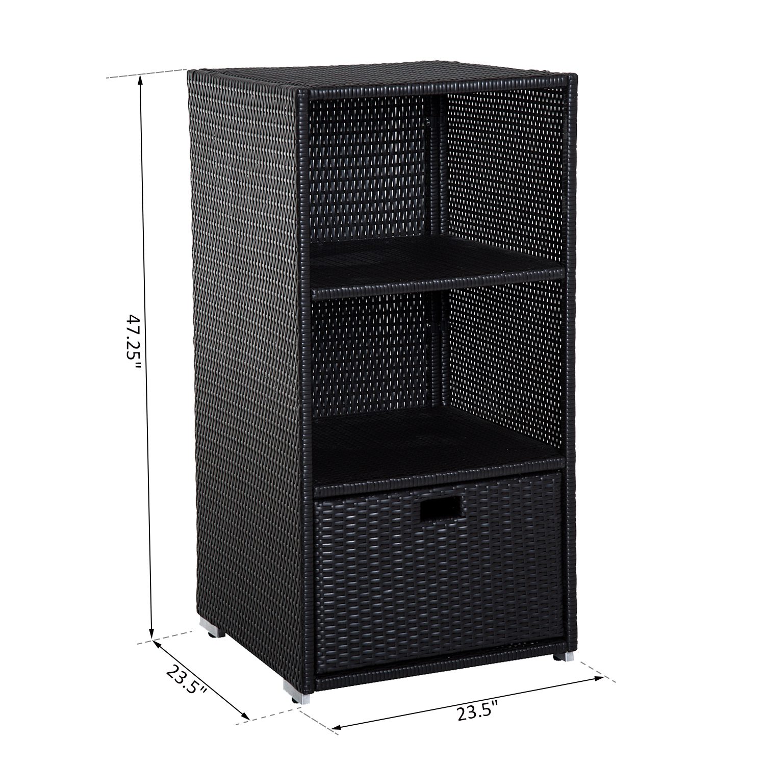 Keep your towels and pool accessories always close by with the convenient [BRAND NAME] 47’Rattan Wicker Outdoor Pool Towel Valet Stand. Constructed from durable aluminum and all-weather PE rattan wicker this handy towel storage cabinet features 2 upper shelves and a large bottom drawer for additional storage options. Add one to your pool or spa deck and impart the look and feel of a resort or private club to your own backyard!
