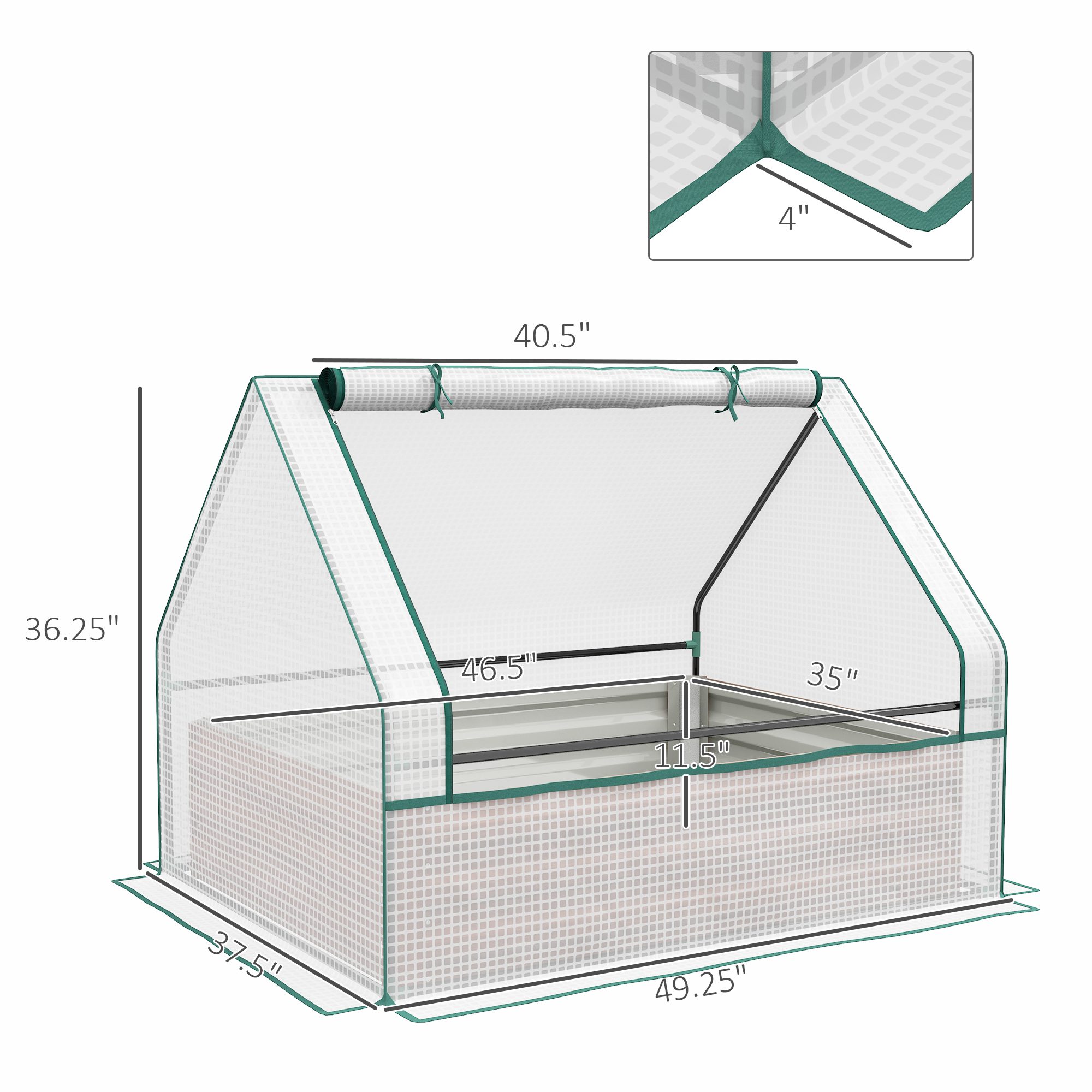 - – Greenhouse Dimensions: 49.25″ L x 37.5″ W x 36.25″ H