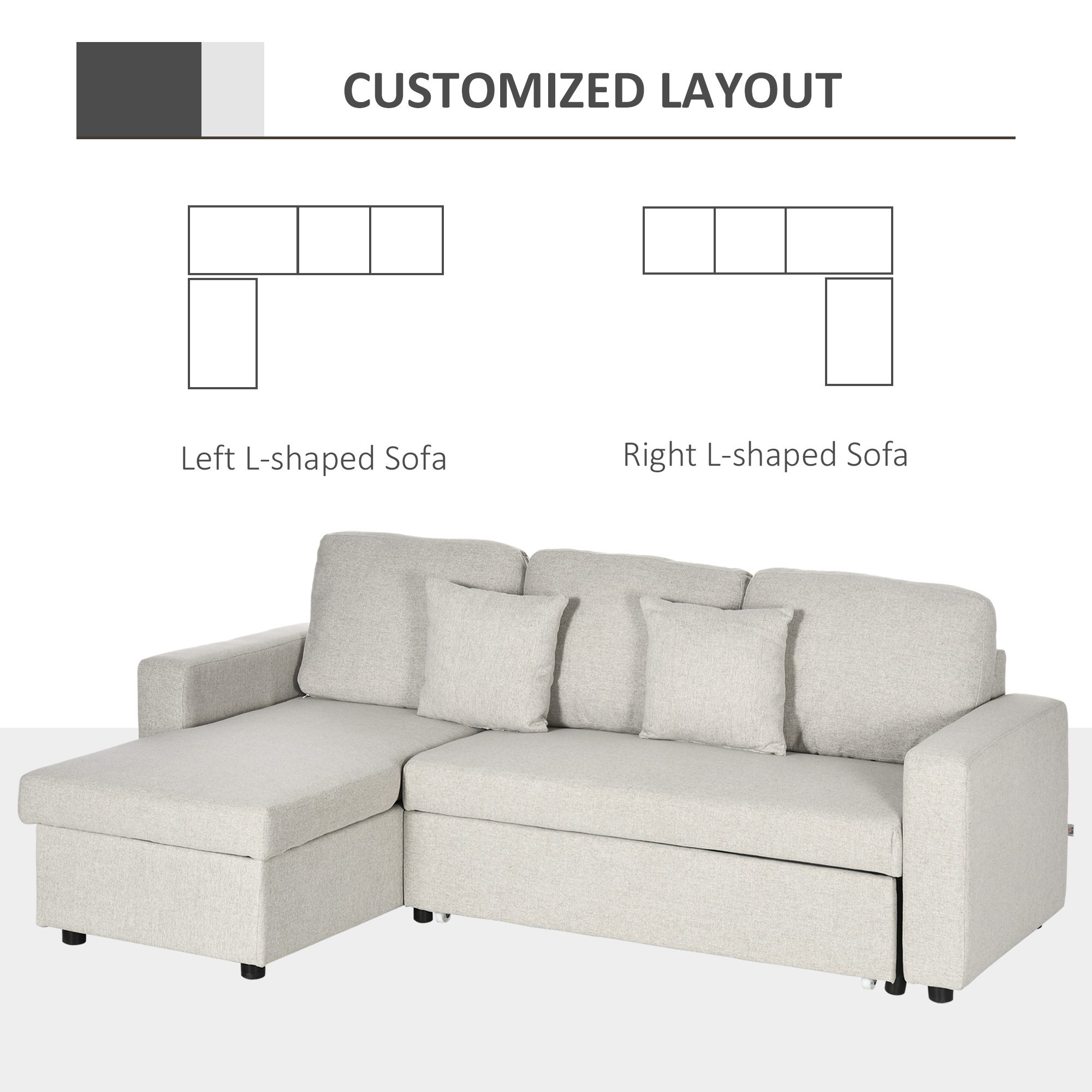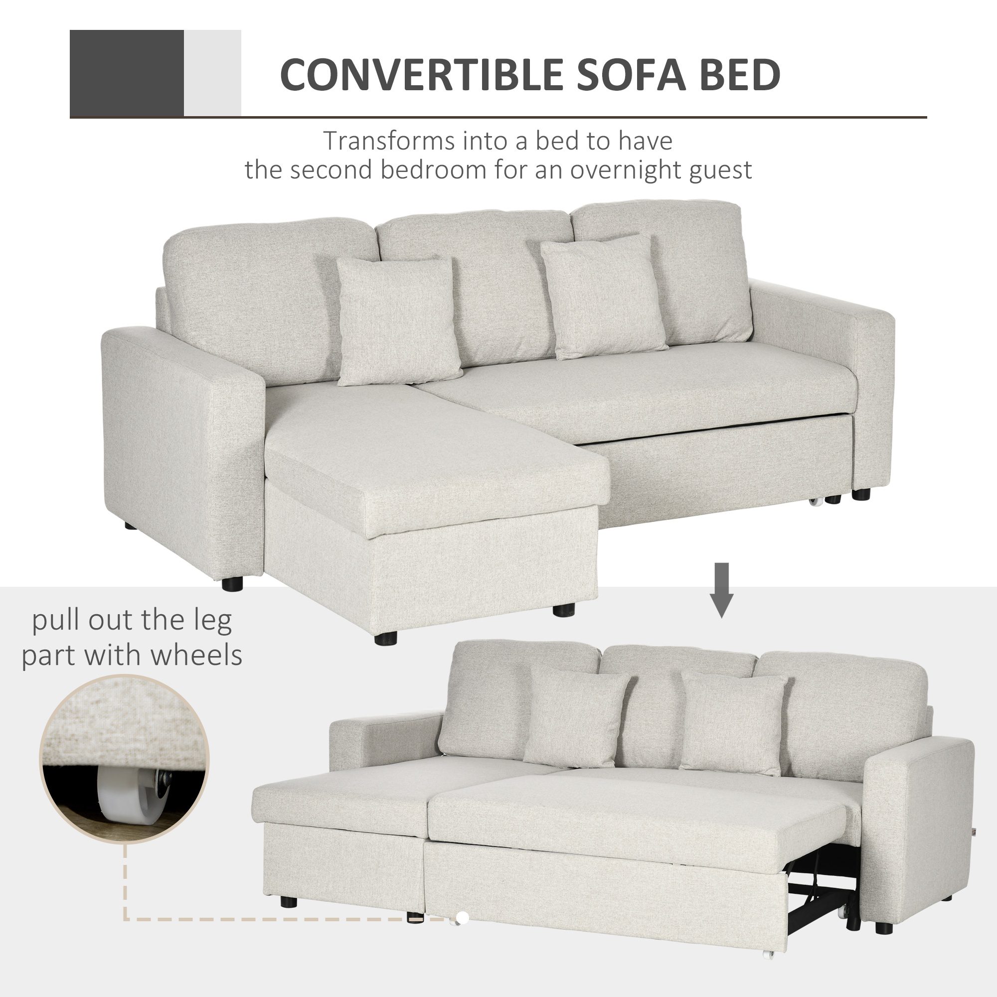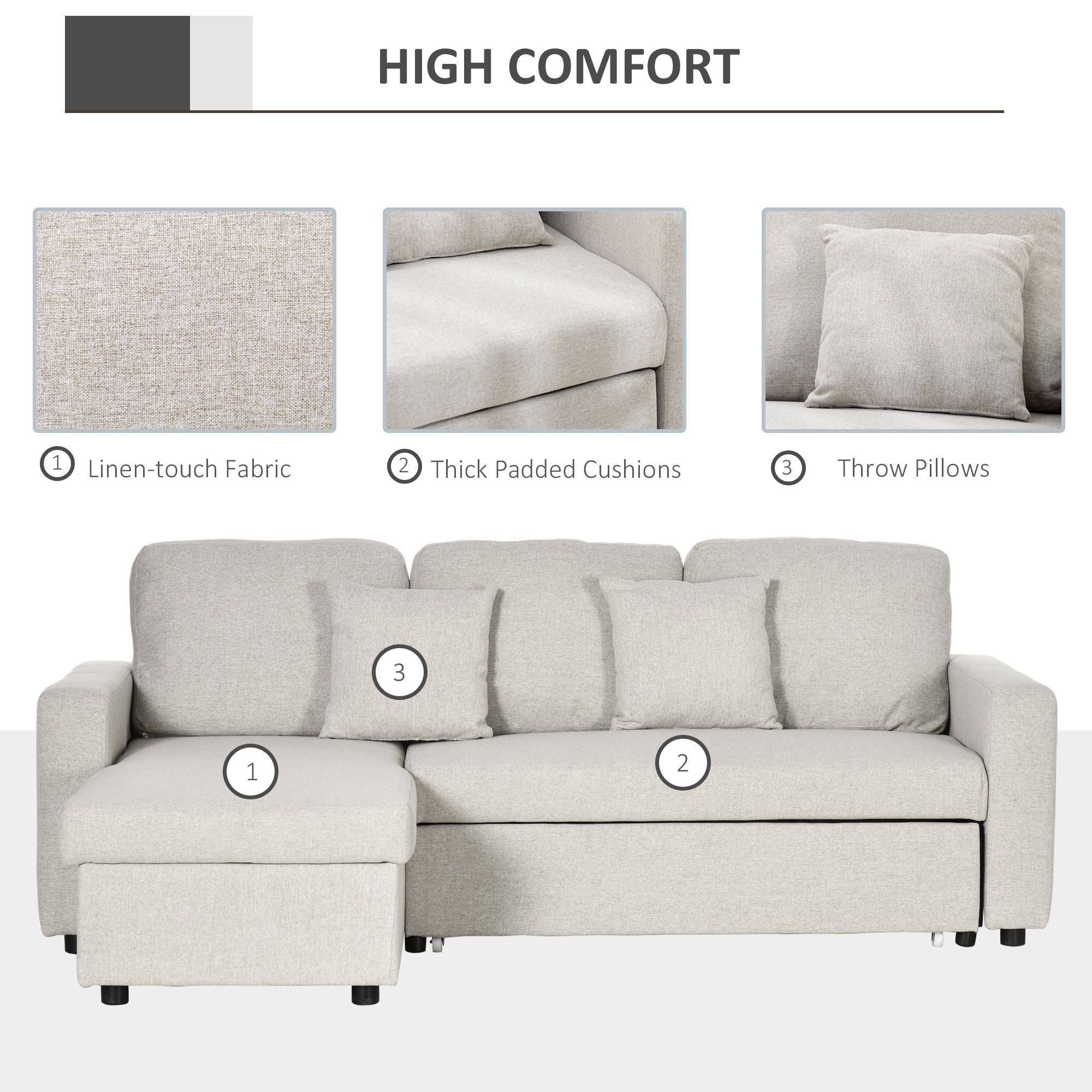 Sectional Sofa Bed, L-Shaped Loveseat Reversible Sleeper Sofa with Pull Out Couch Bed, Storage Chaise, Cushions, Linen Feel Fabric Futon Sofa Bed for Living Room, Cream White 89.75"