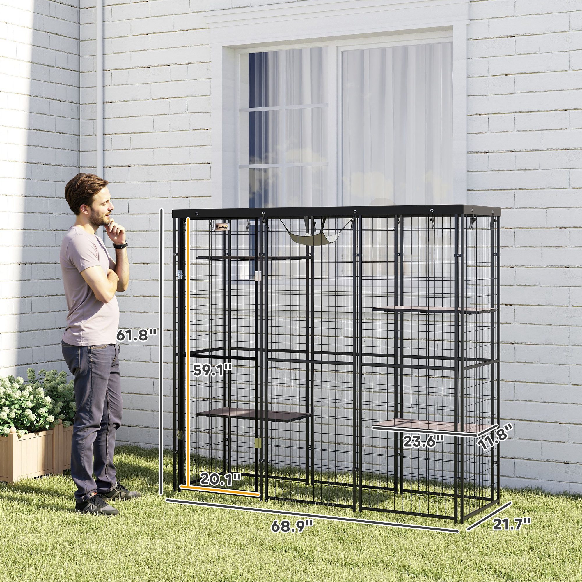Weld Wire Catio Outdoor Indoor with Waterproof Cover, 4 Jumping Platforms, Hammock, for 1-3 Kittens, 69" x 22" x 62"
