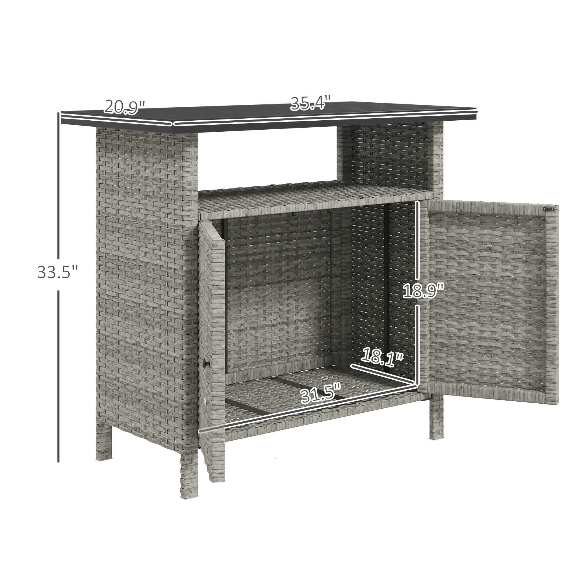 Make your pool feel like a resort. Keep your outdoor accessories close by with [BRAND NAME]’s outdoor console table. This patio bar table has three ways of storage: a tabletop, an open shelf, and an enclosed cabinet with a snap-fit closure. Keep clean towels up behind closed doors. Keep outdoor dining accessories, pool floaties, suntan lotion, or goggles on the shelf. PE wicker wrapped around a steel frame, the outdoor kitchen island is UV, weather resistant. Get out, get organized, get [BRAND NAME].