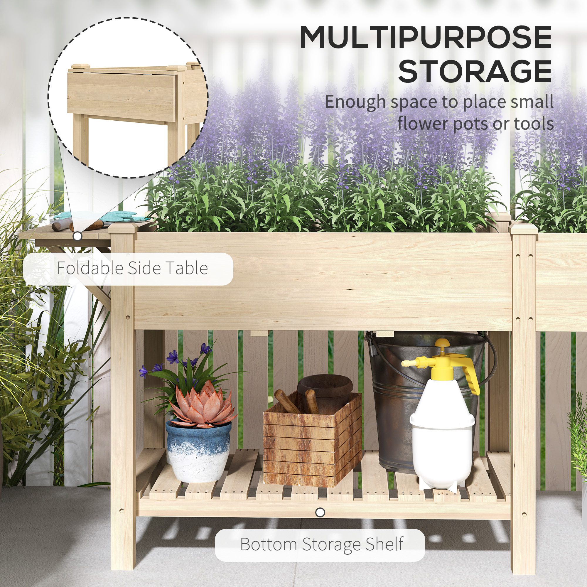 Wood Raised Garden Box, Elevated Garden Bed with Side Table, Bottom Shelf, Bed Liners and Drainage Holes, Natural