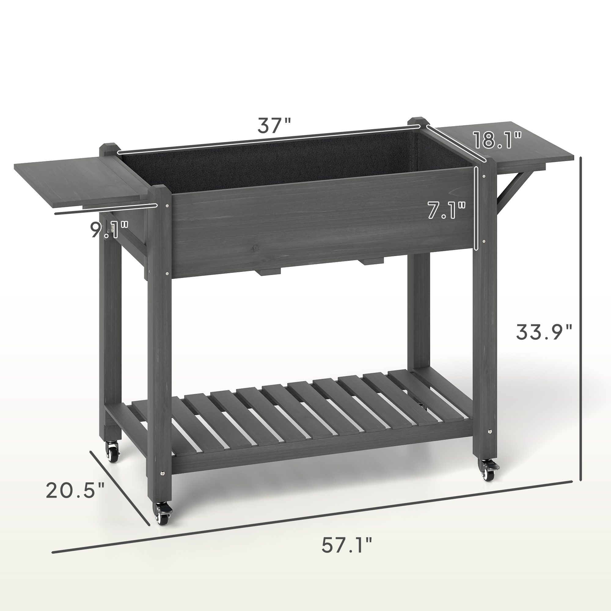 Wood Raised Planter Box, Elevated Garden Bed with Lockable Wheels, Side Tables, Bottom Shelf, Drain Holes, Gray